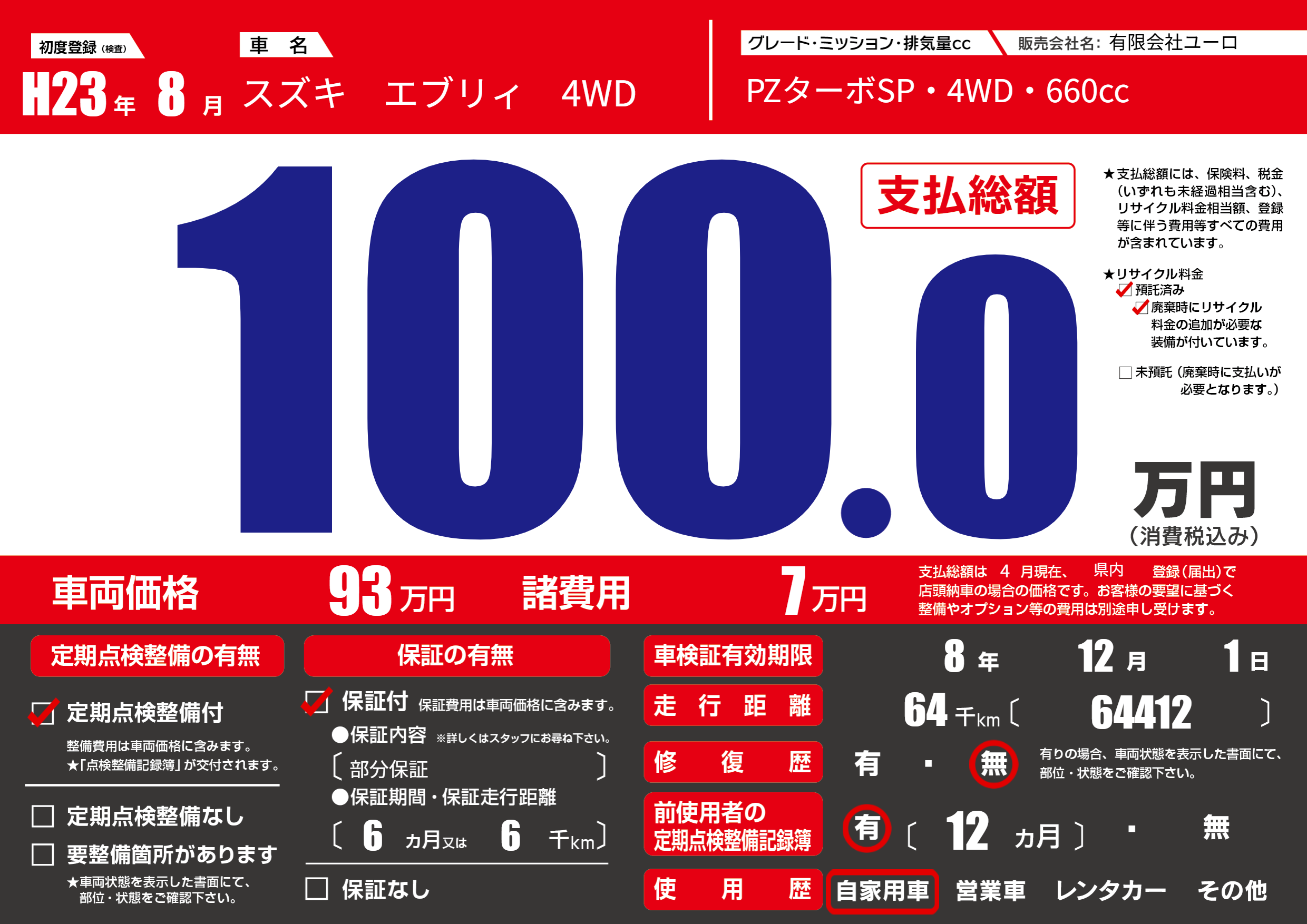 | 車名 | スズキ エブリィ 4WD | グレード ミッション 排気量 |
