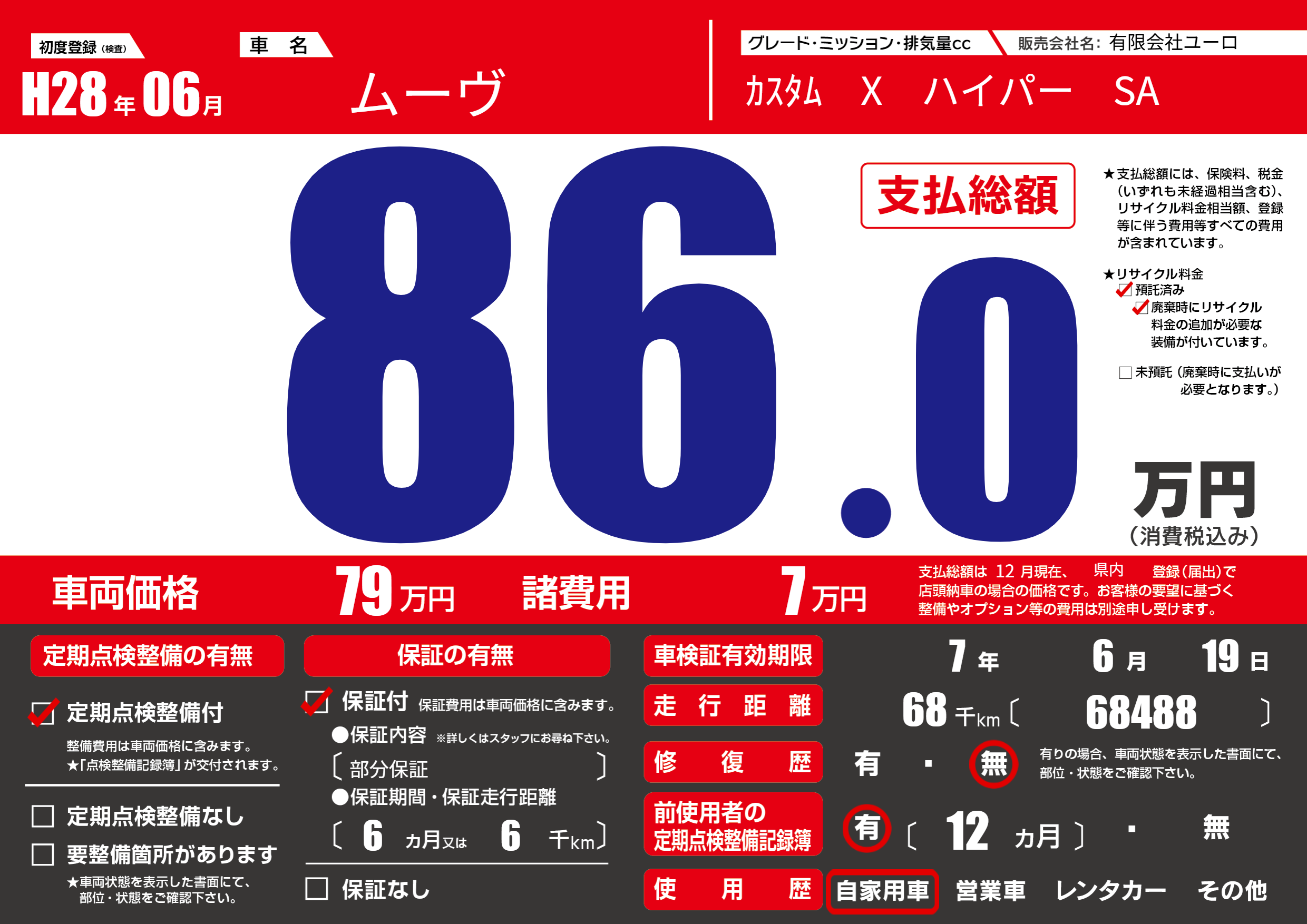 | 走行キロ | 6.8万km | 初年度登録 | H28年06月 |