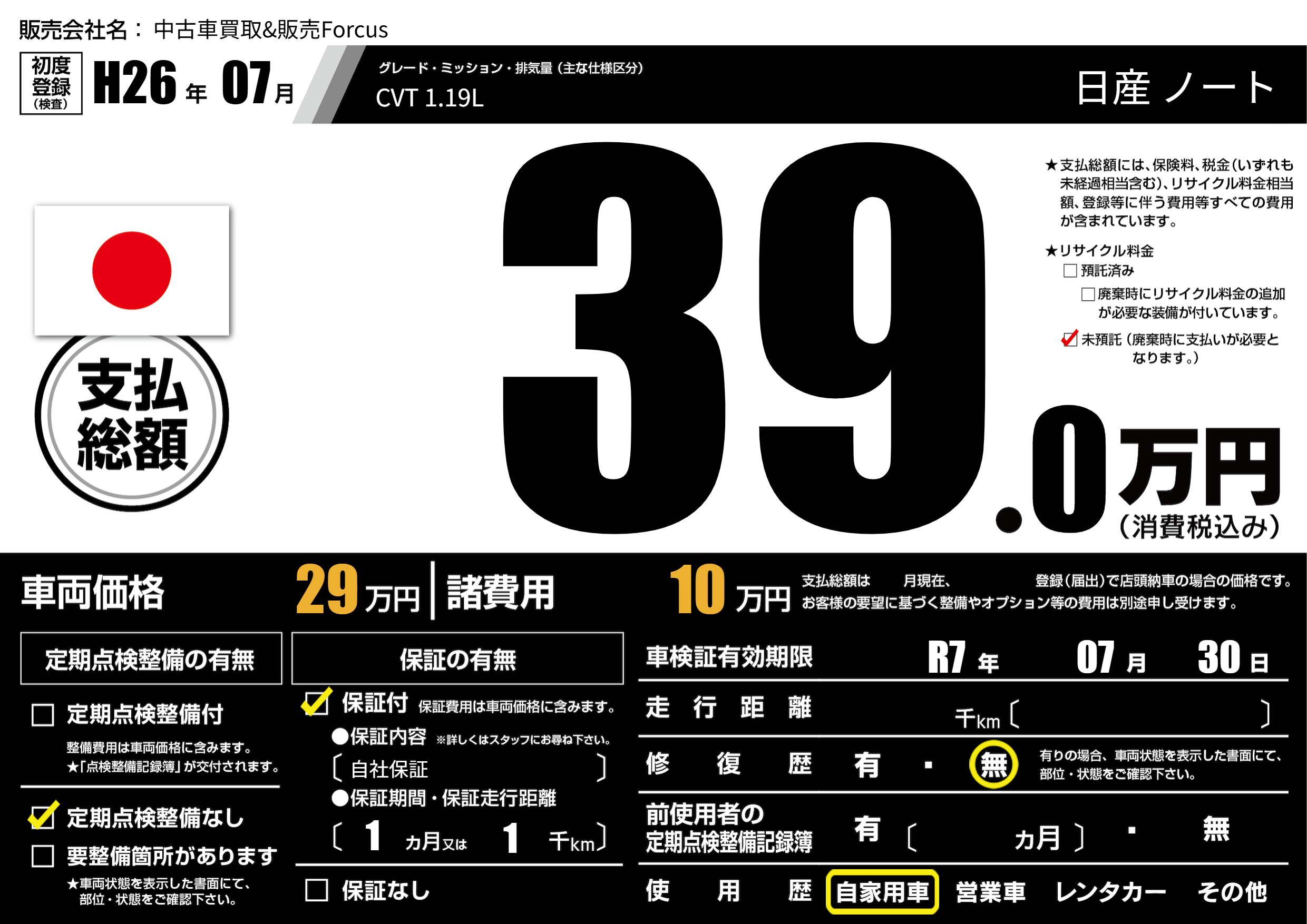 | 車名 | 日産 ノート | グレード ミッション 排気量 |