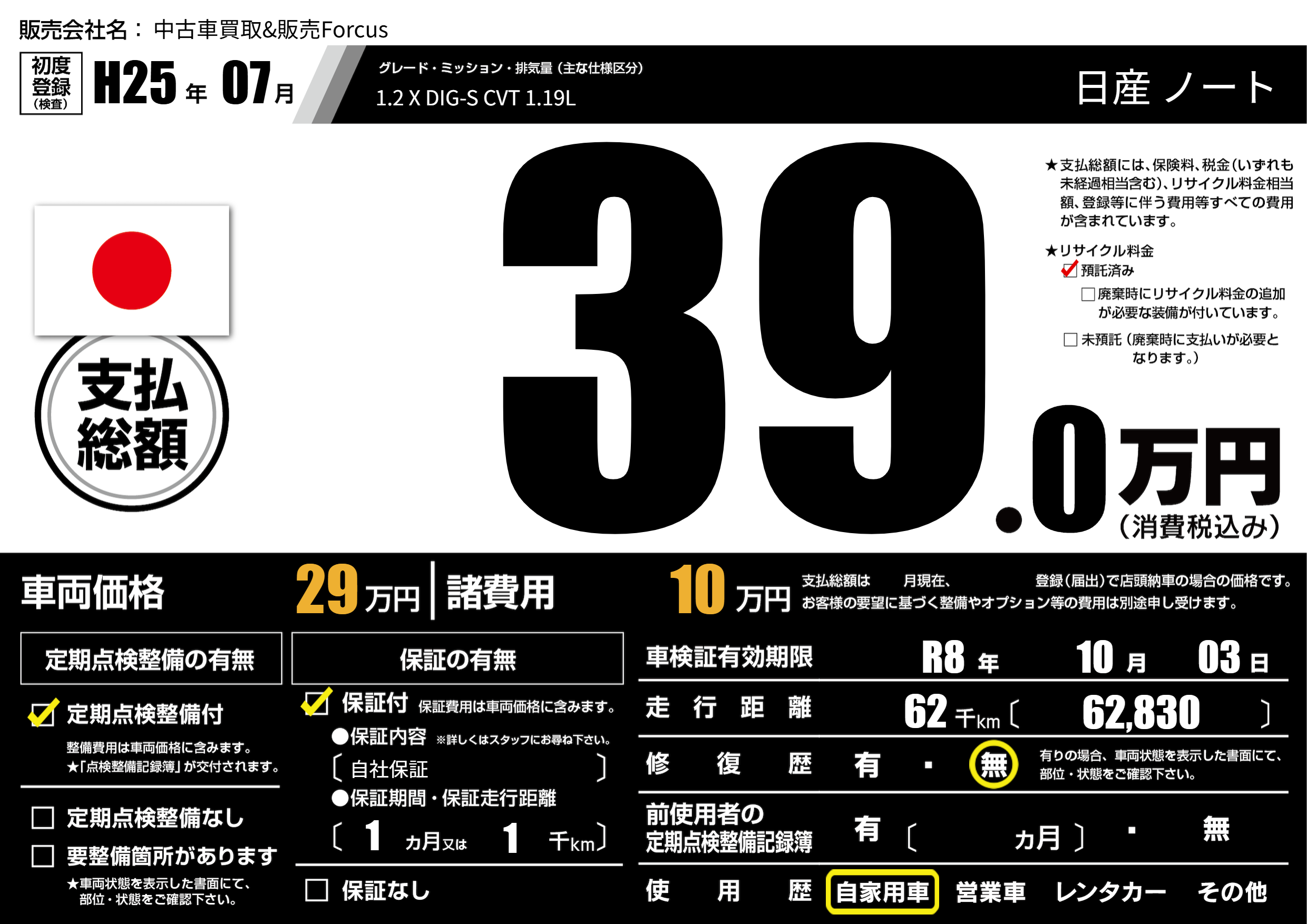 | 走行キロ | 6.2万km | 初年度登録 | H25年07月 |