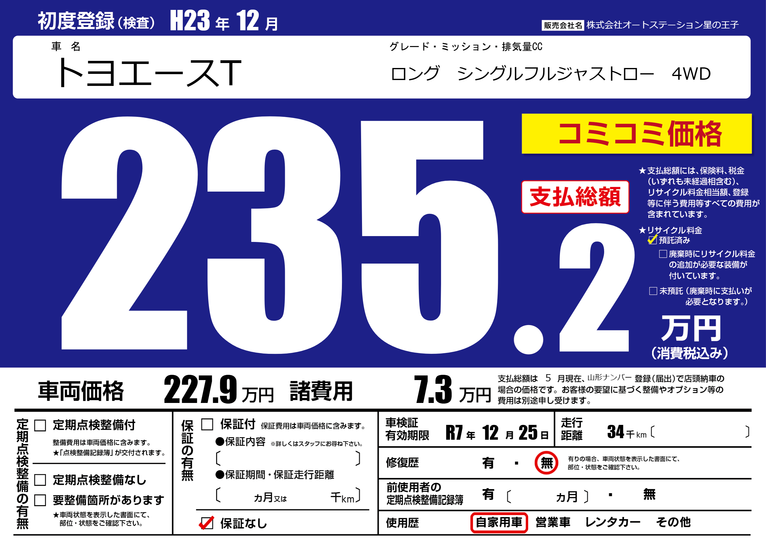 | 走行キロ | 3.4万km | 初年度登録 | H23年12月 |