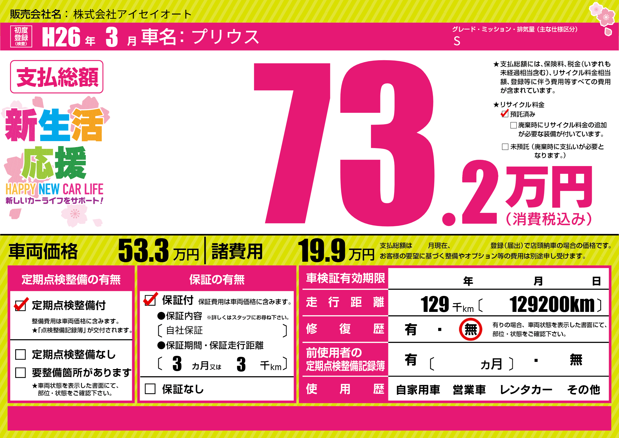 | 車名 | プリウス | グレード ミッション 排気量 |