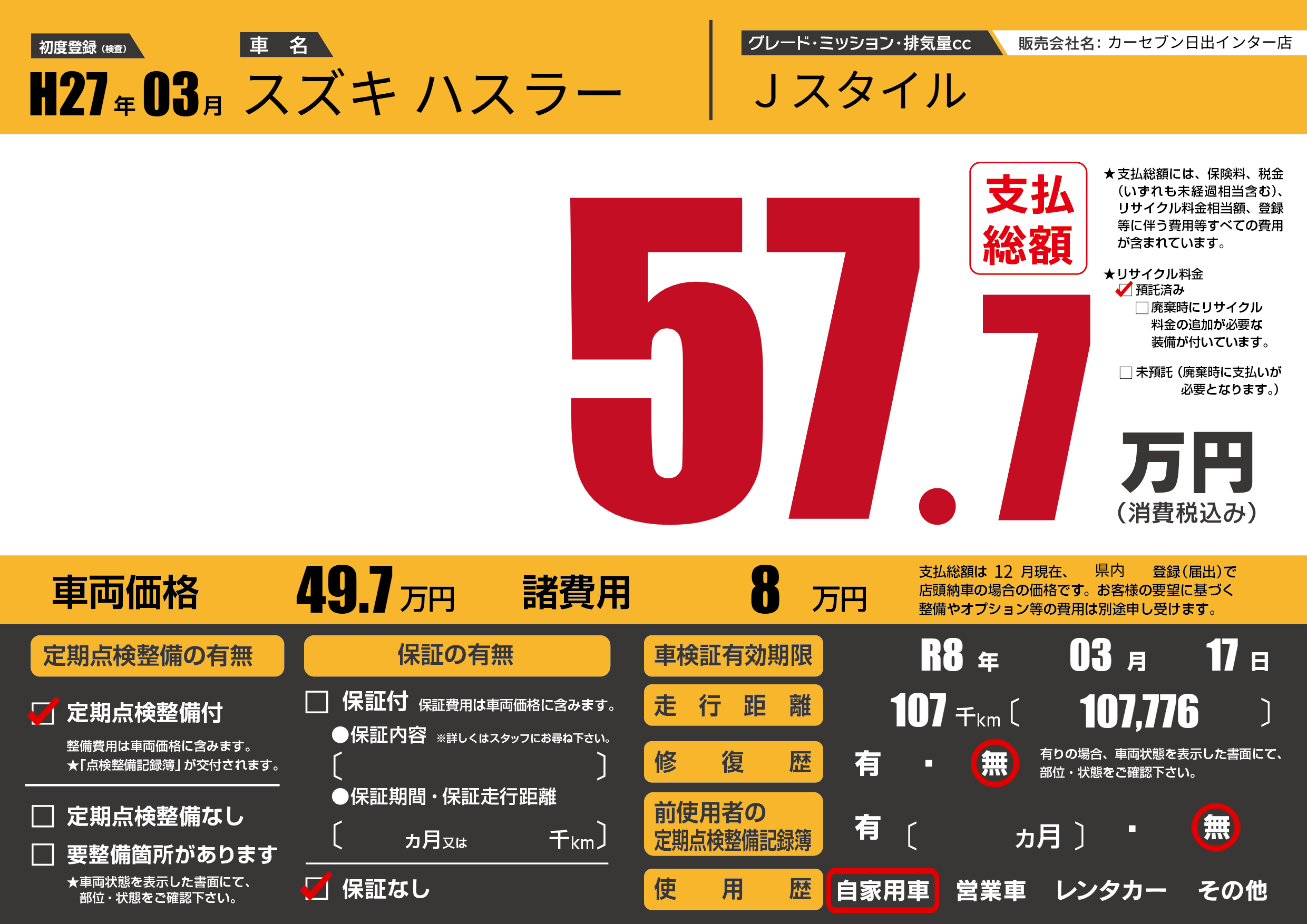 | 走行キロ | 10.7万km | 初年度登録 | H27年03月 |