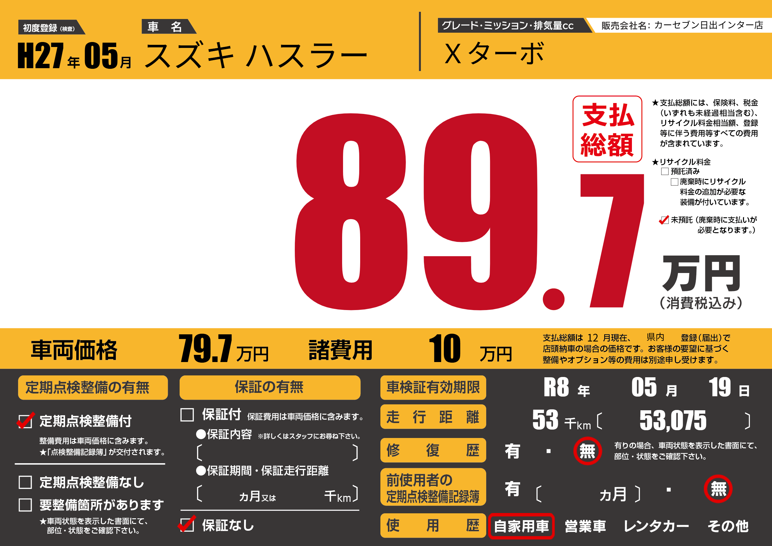 | 走行キロ | 5.3万km | 初年度登録 | H27年05月 |