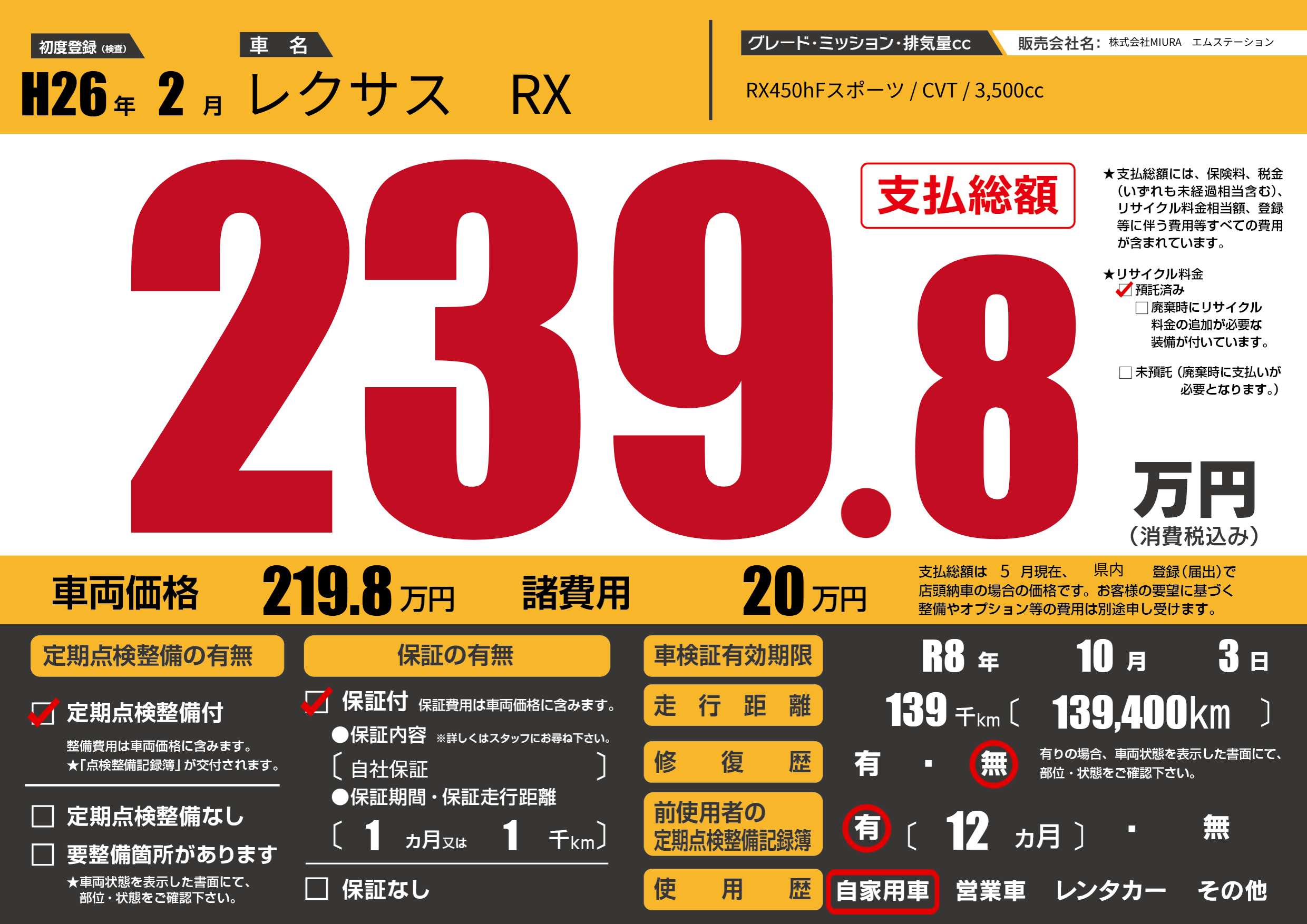 | 車名 | レクサス RX | グレード ミッション 排気量 |