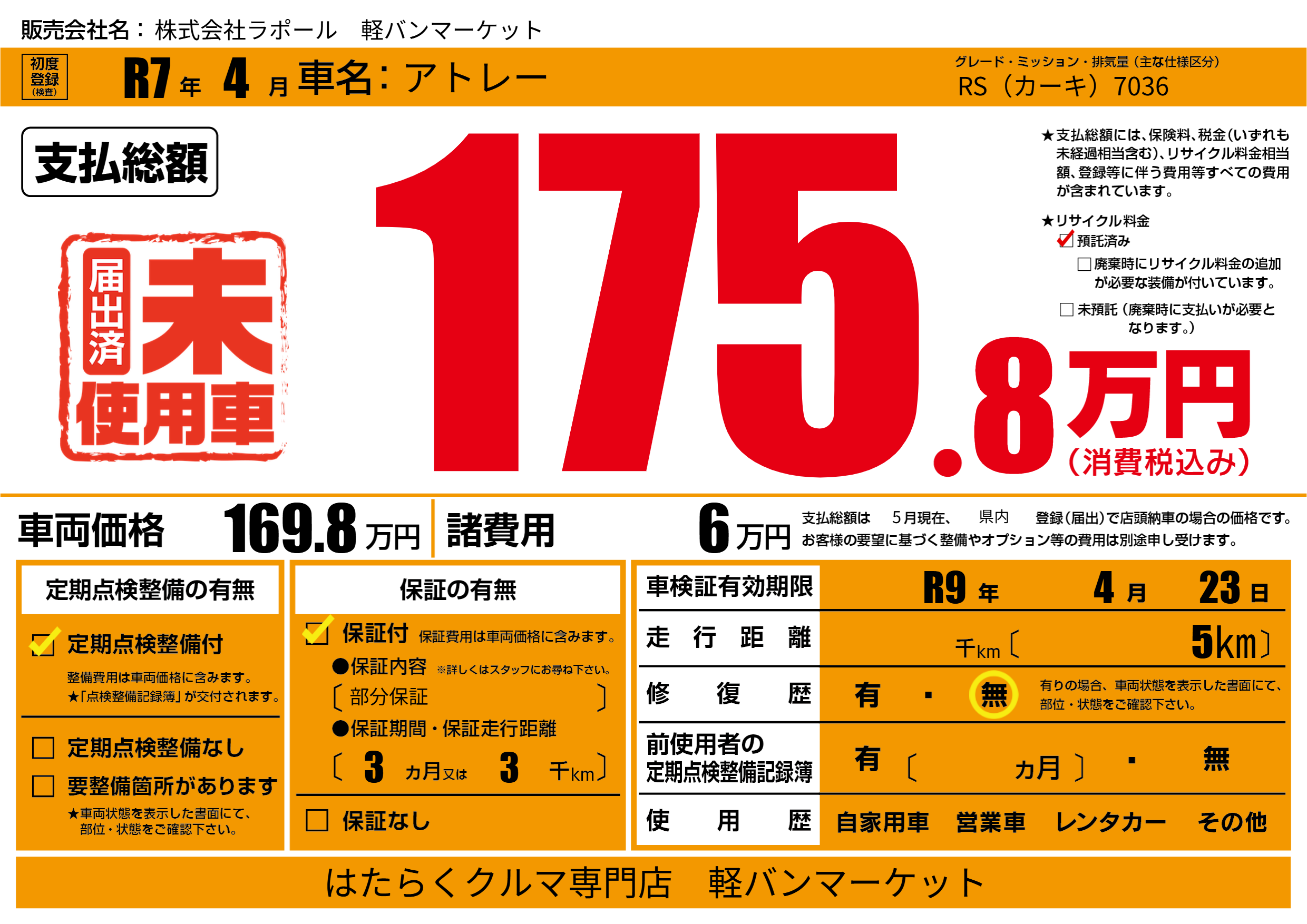 | 走行キロ | - | 初年度登録 | R7年4月 |