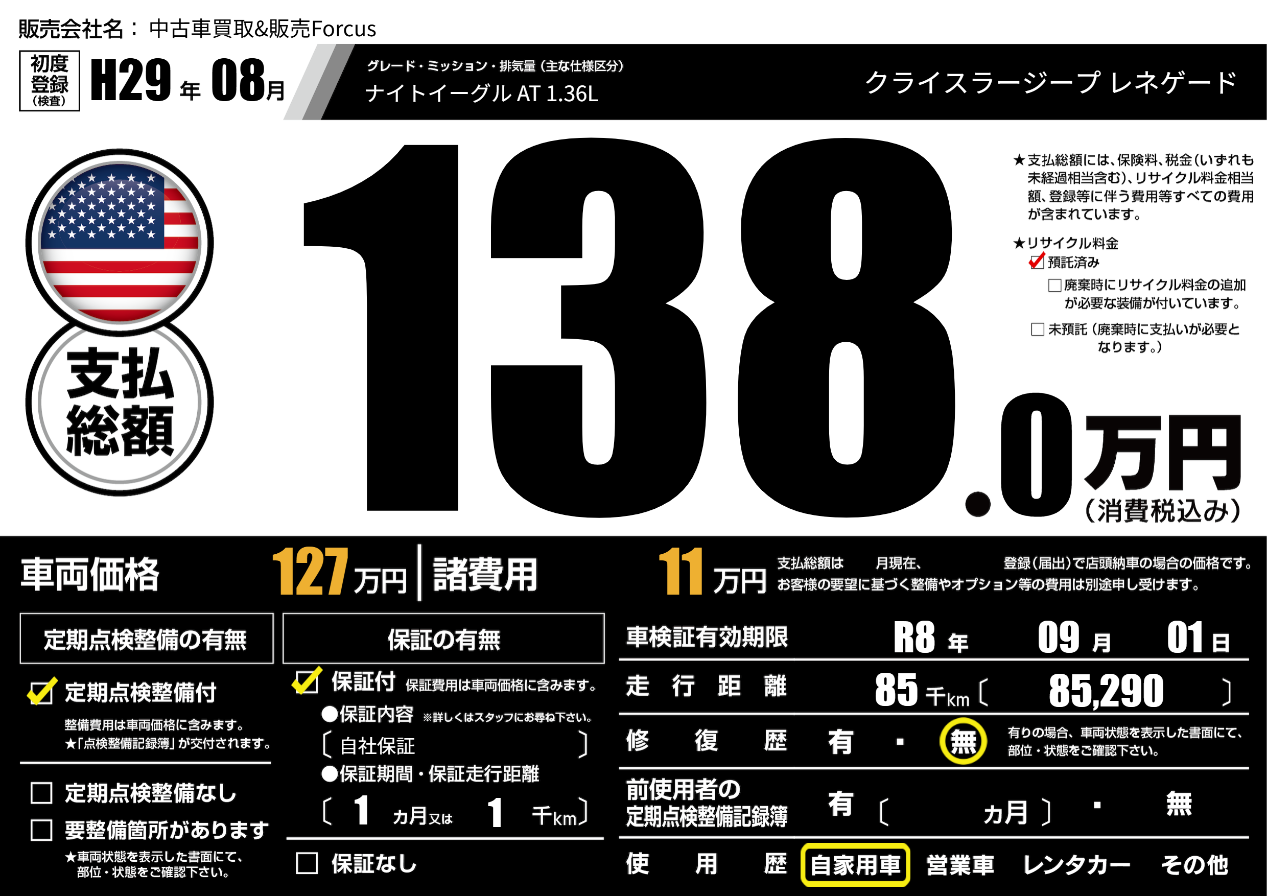 | 車名 | クライスラージープ レネゲード | グレード ミッション 排気量 |