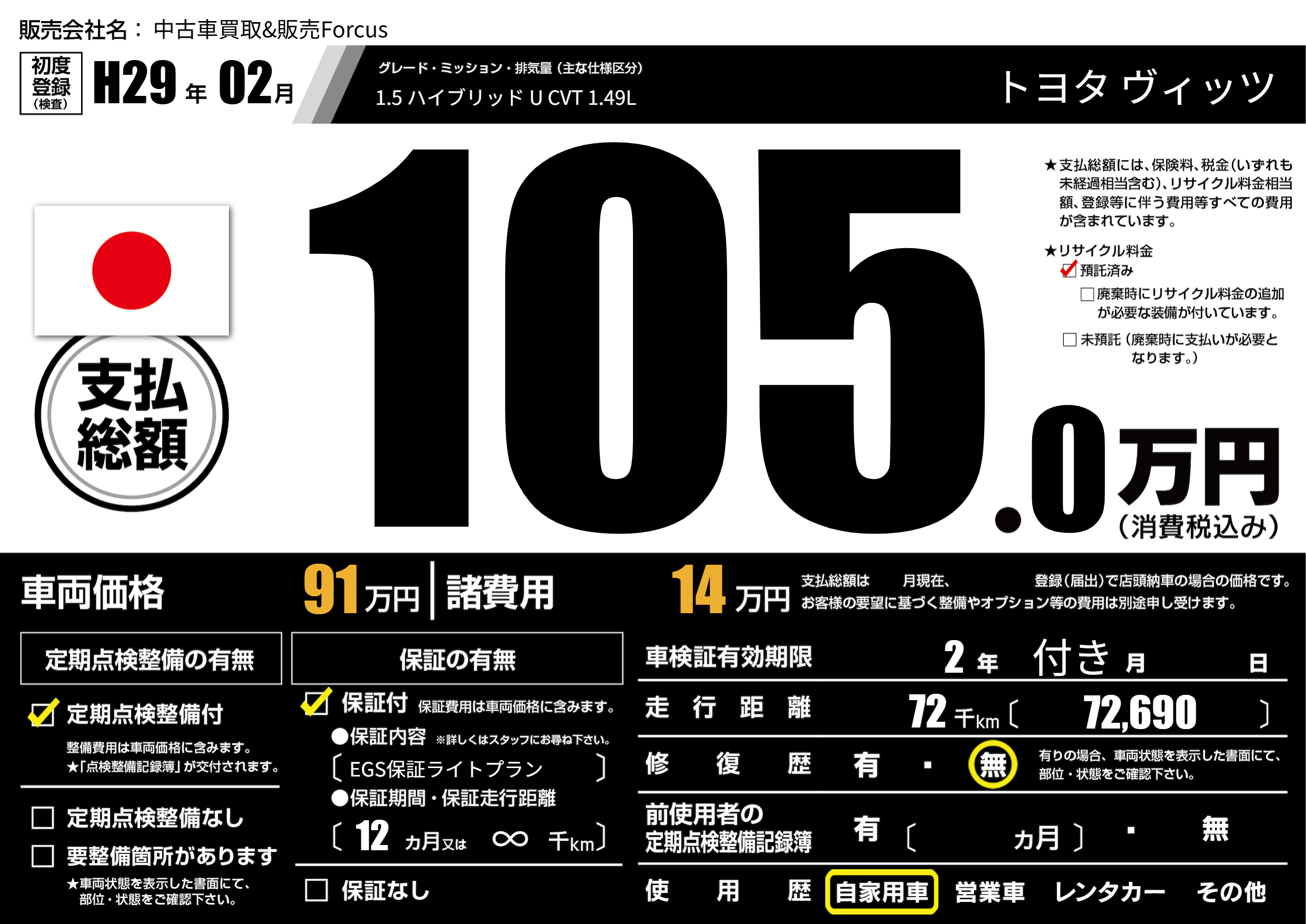 | 走行キロ | 7.2万km | 初年度登録 | H29年02月 |