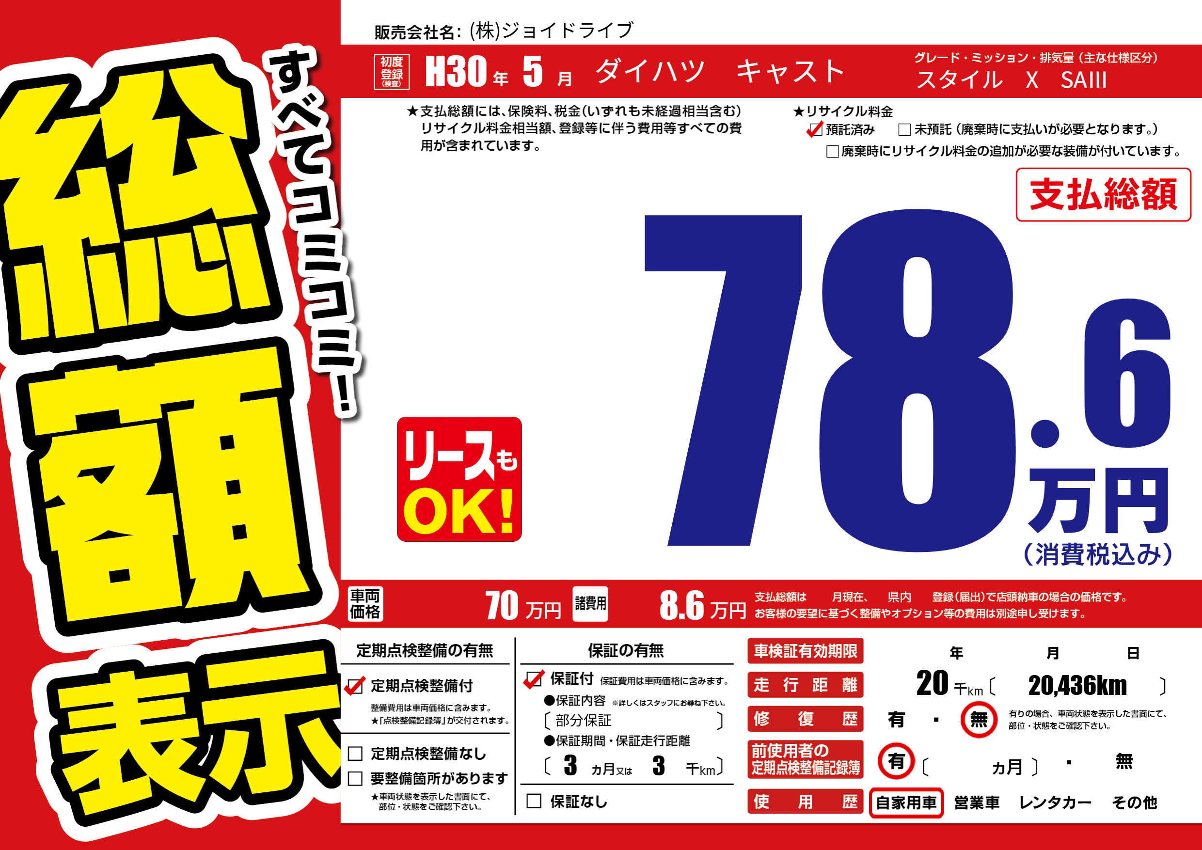 | 車名 | ダイハツ キャスト | グレード ミッション 排気量 |