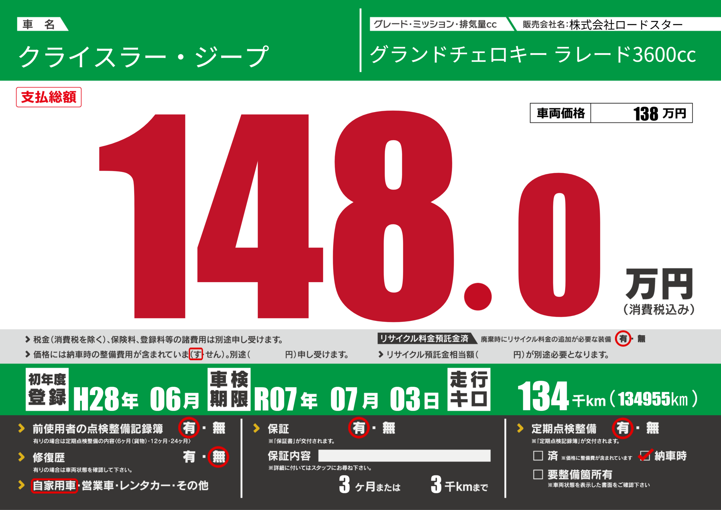 保証付き 保証内容(---) 3ヶ月または(3)千kmまで |
