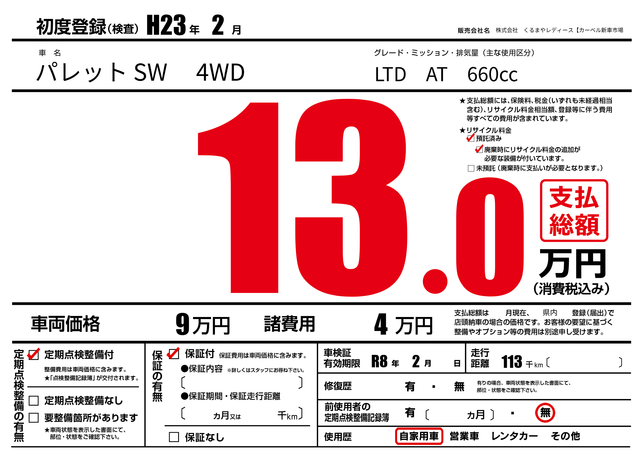 | 走行キロ | 11.3万km | 初年度登録 | H23年2月 |