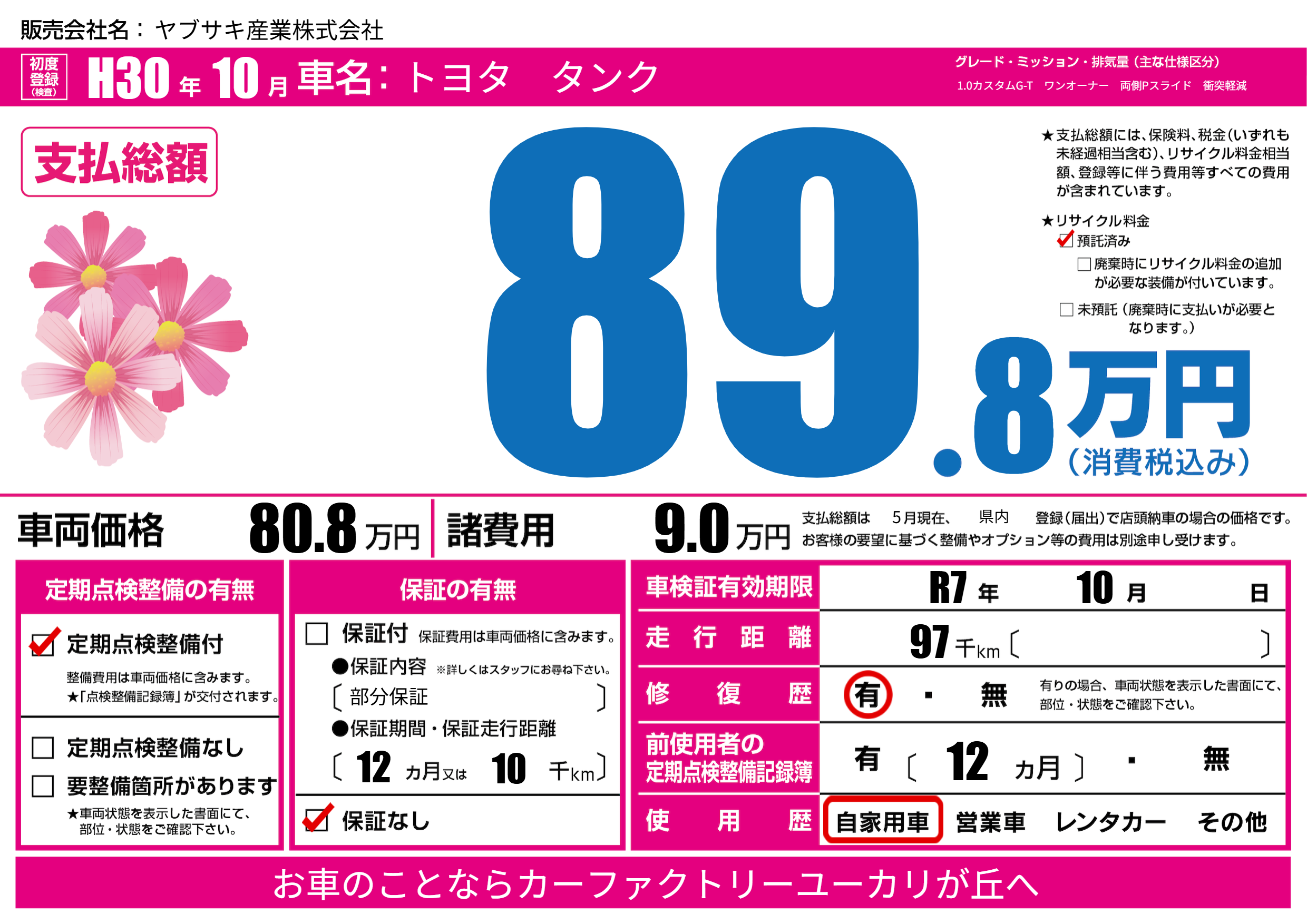 | 車名 | トヨタ タンク | グレード ミッション 排気量 |
