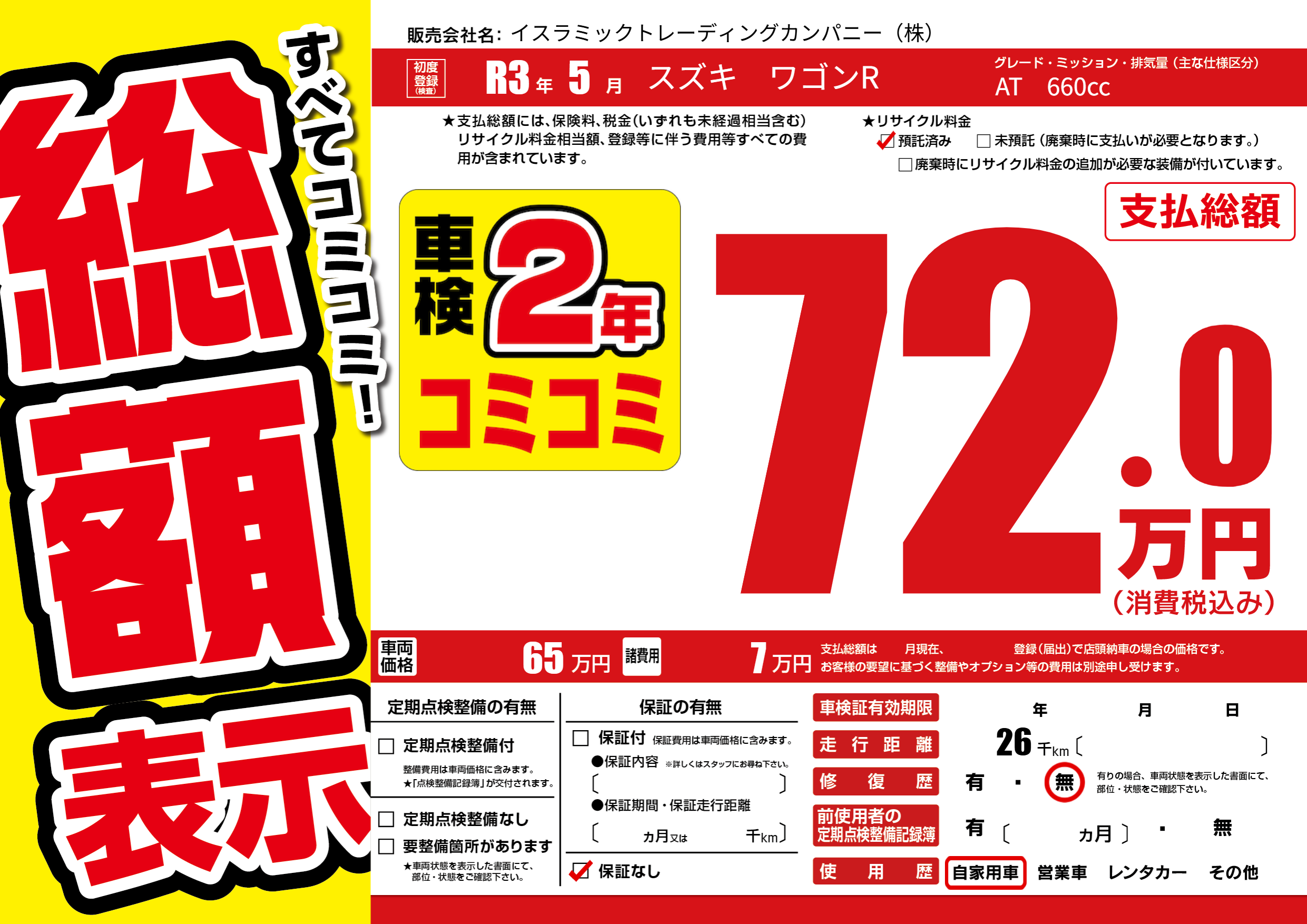 | 車名 | スズキ ワゴンR | グレード ミッション 排気量 |