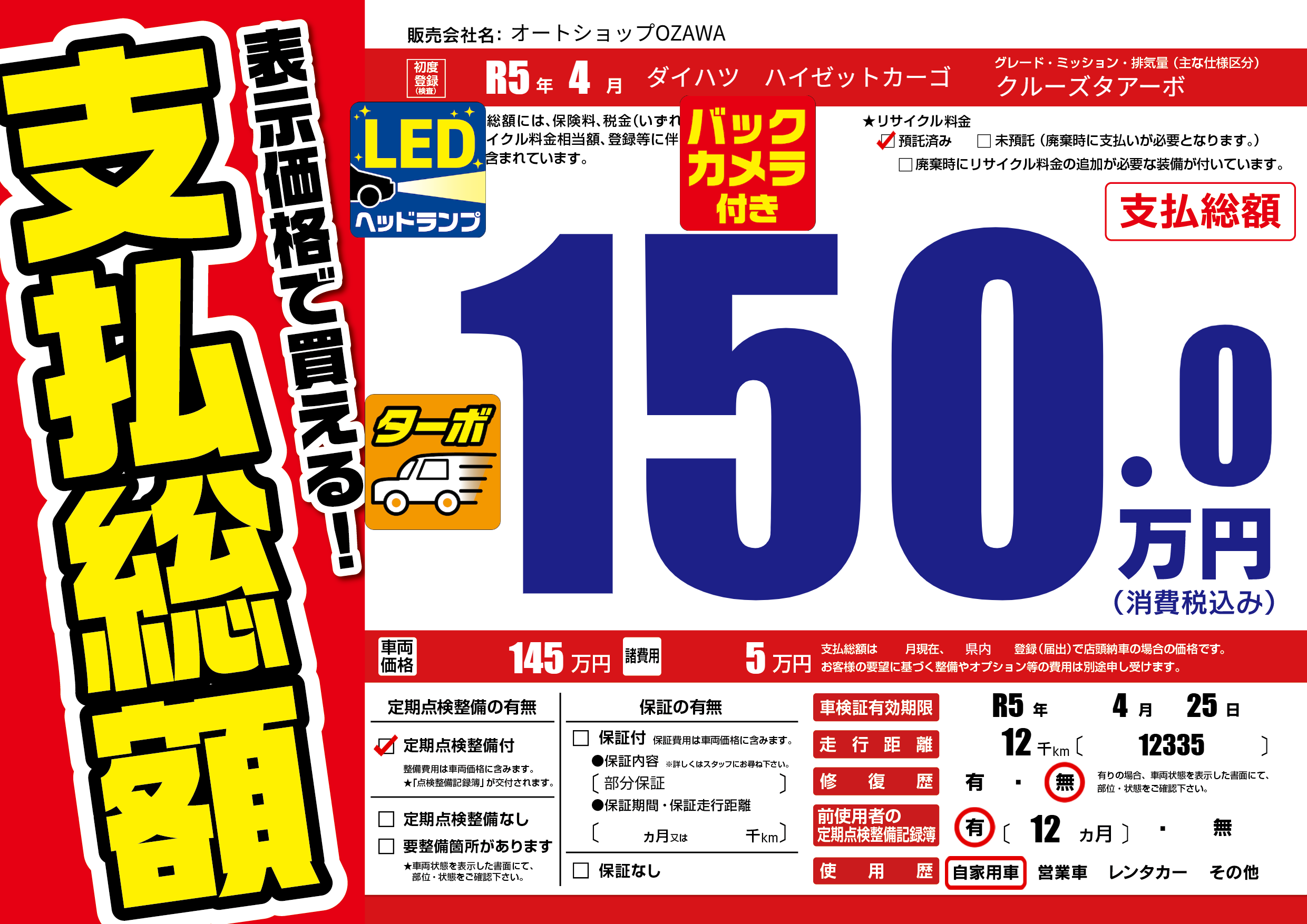 | 走行キロ | 1.2万km | 初年度登録 | R5年4月 |