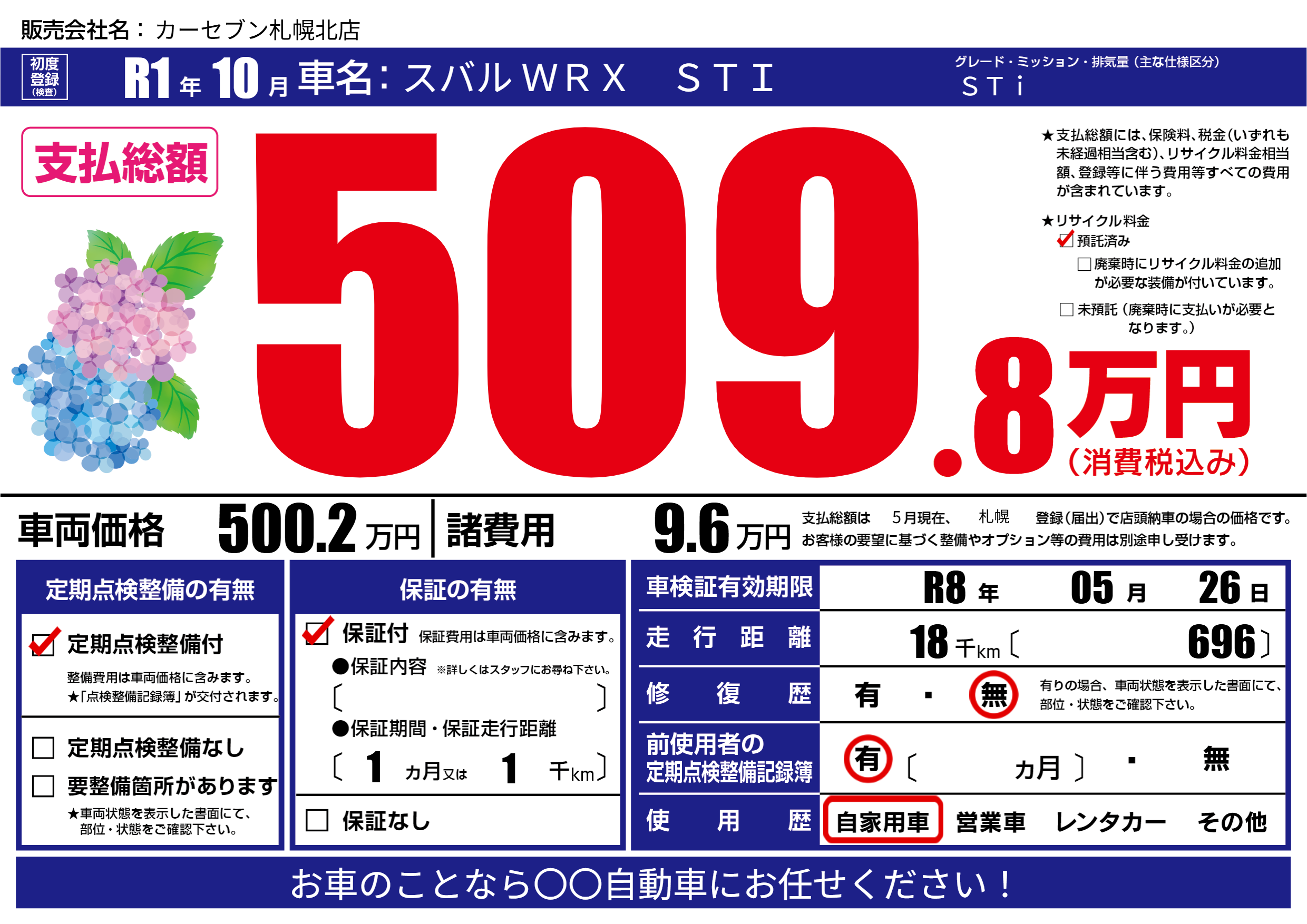 | 車名 | スバル WRX STI | グレード ミッション 排気量 |
