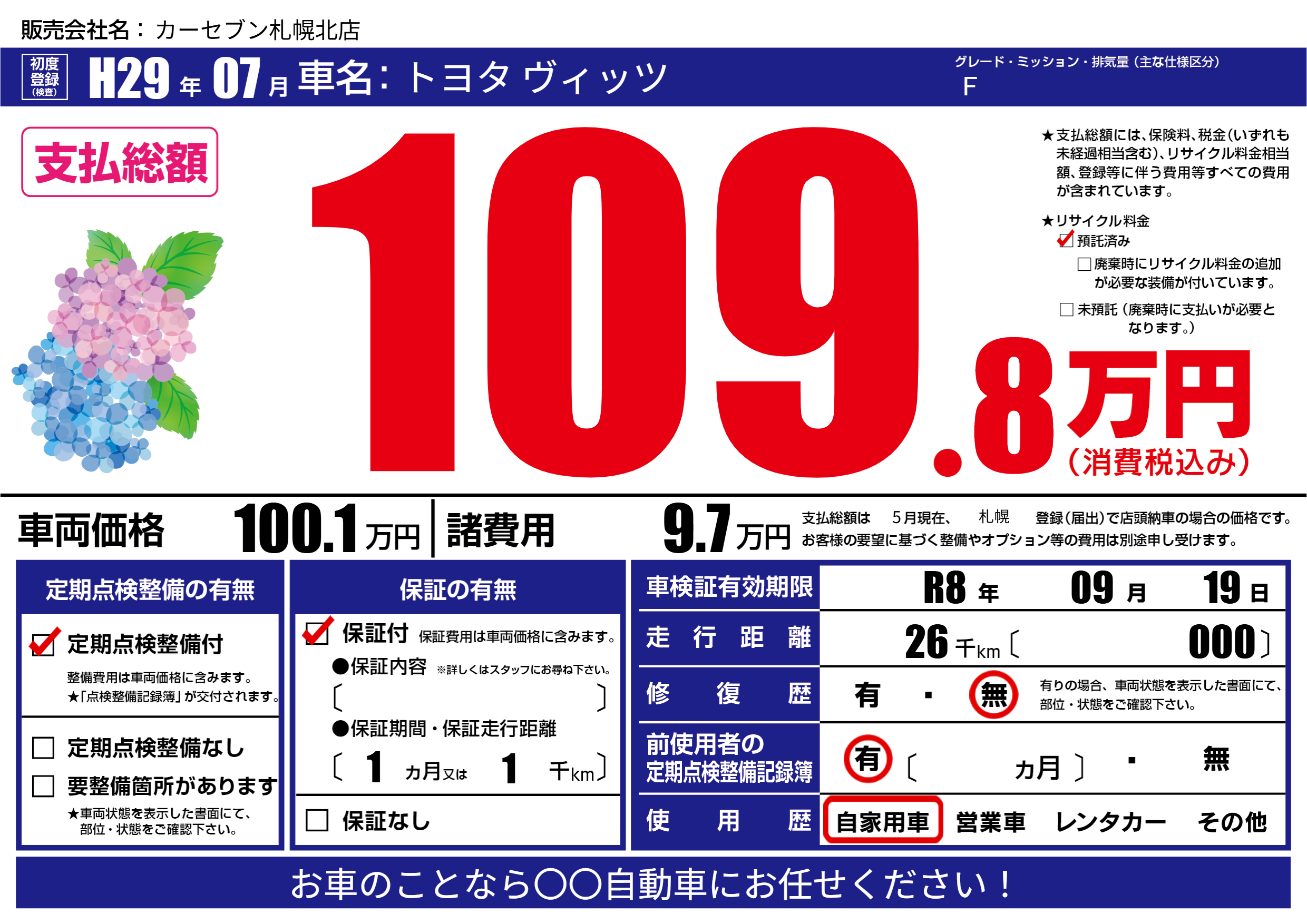 | 走行キロ | 2.6万km | 初年度登録 | H29年07月 |