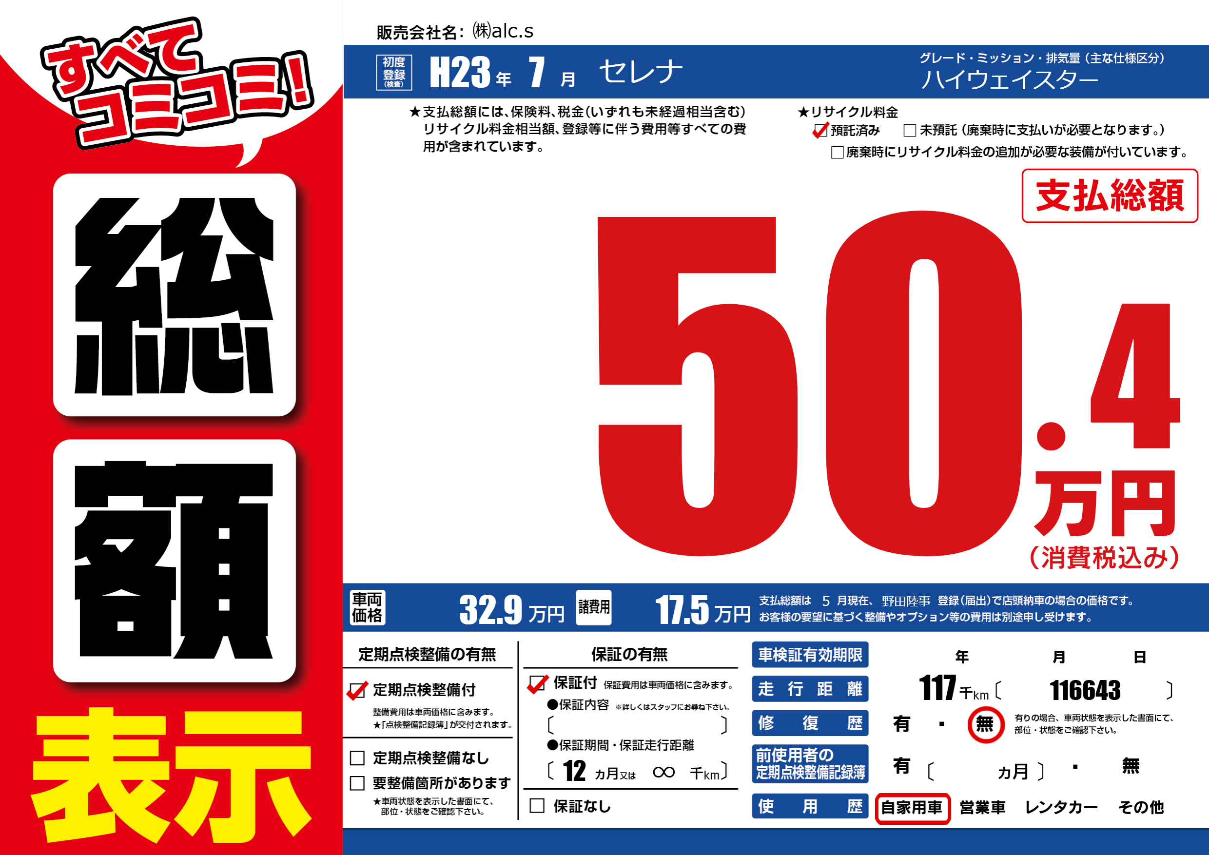 | 走行キロ | 11.7万km | 初年度登録 | H23年7月 |