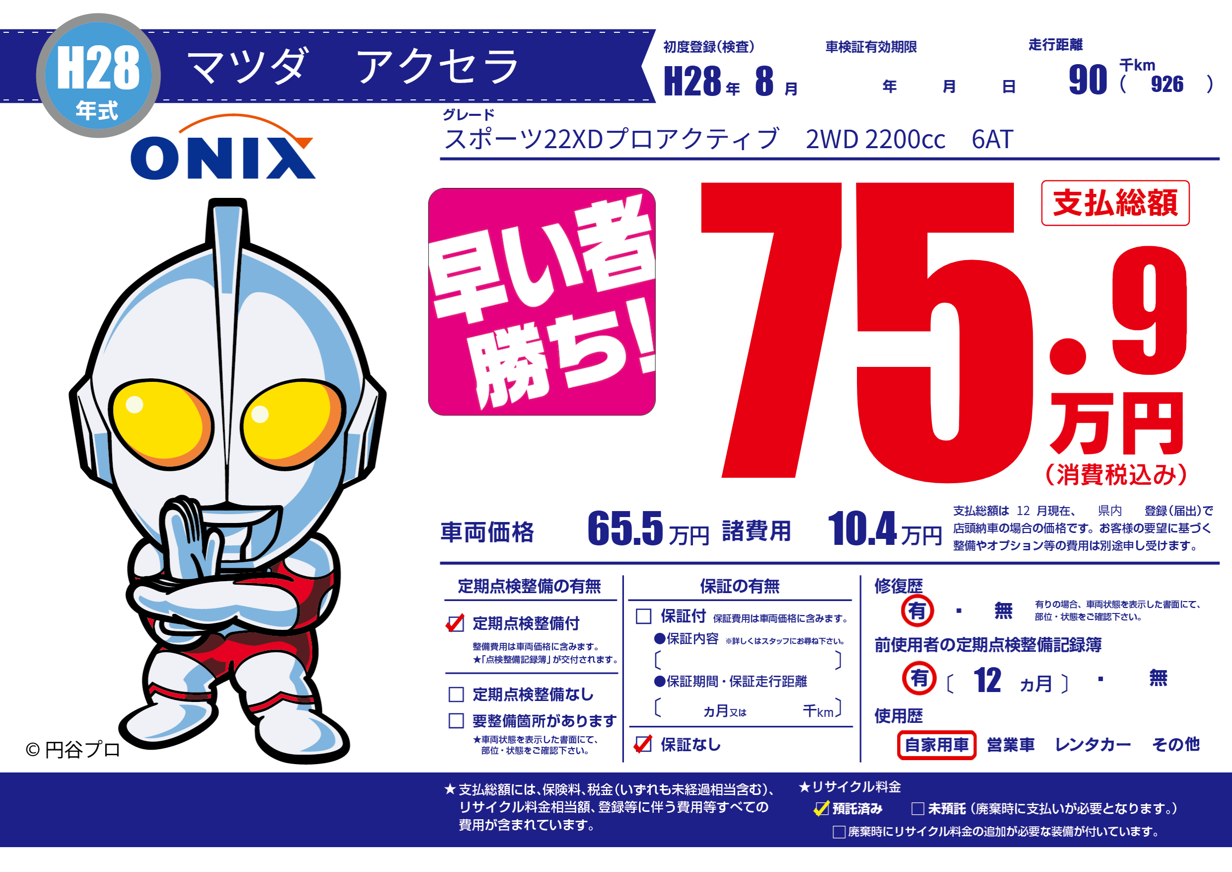 | 走行キロ | 9万km | 初年度登録 | H28年8月 |