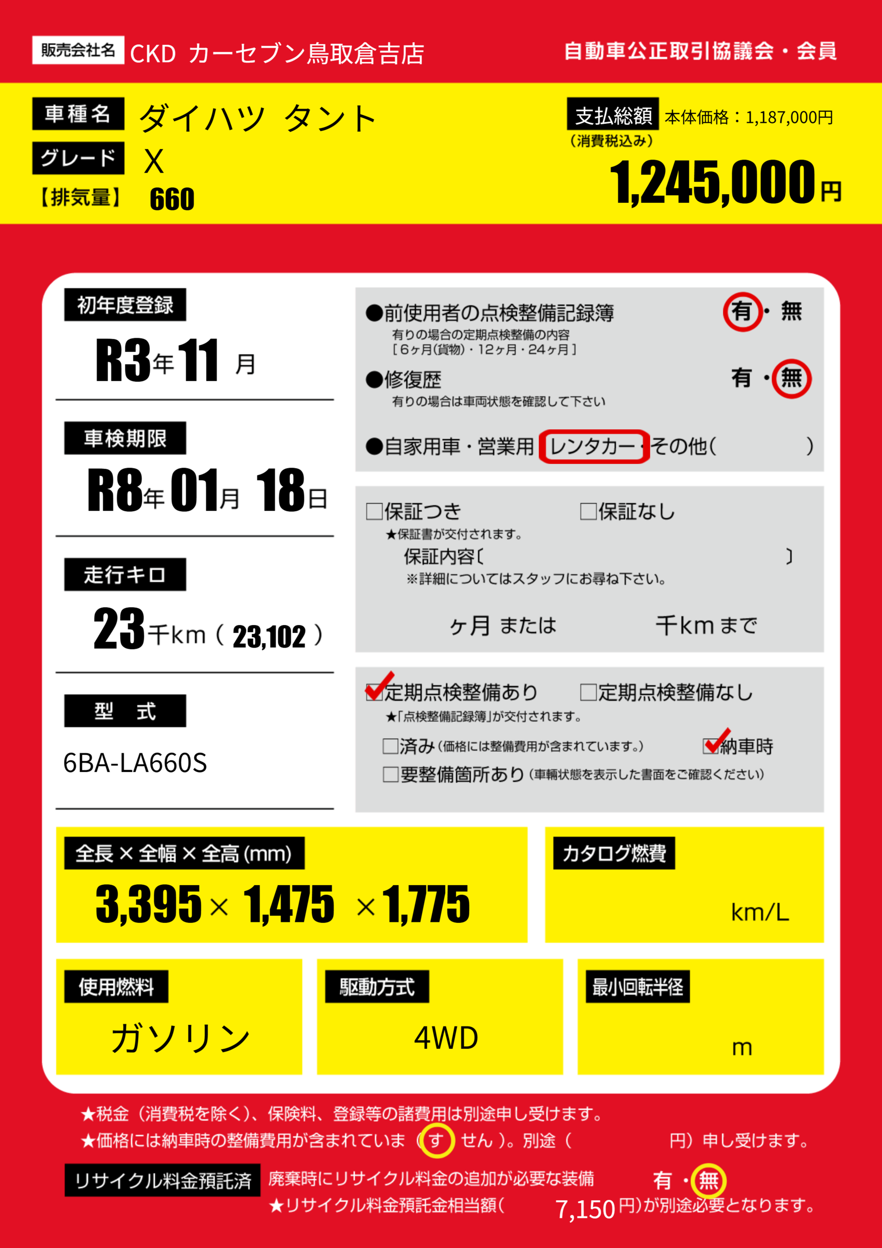 | 車名 | ダイハツ タント | グレード ミッション 排気量 |