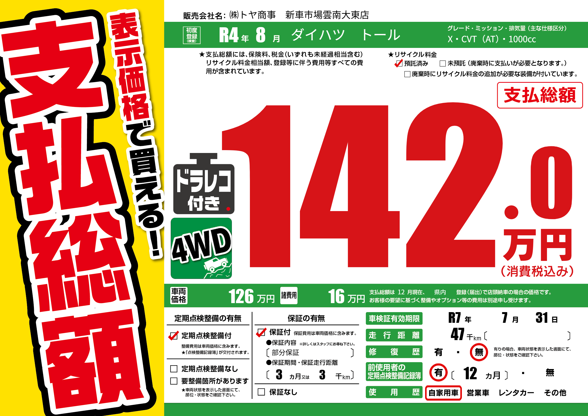 | 車名 | ダイハツ トール | グレード ミッション 排気量 |