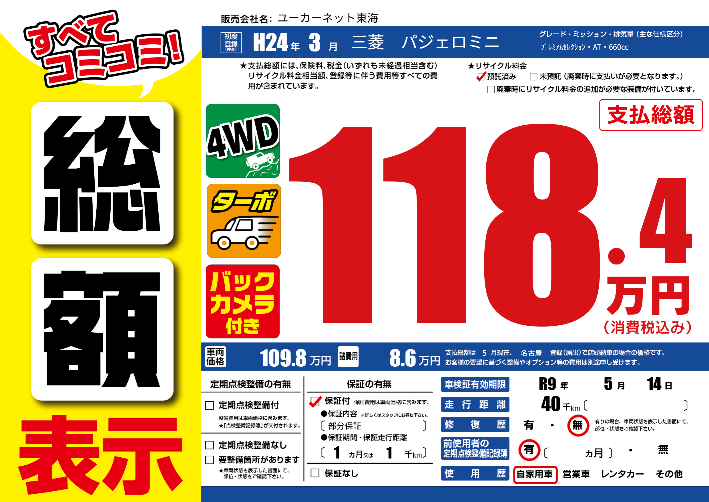 | 車名 | 三菱 パジェロミニ | グレード ミッション 排気量 |