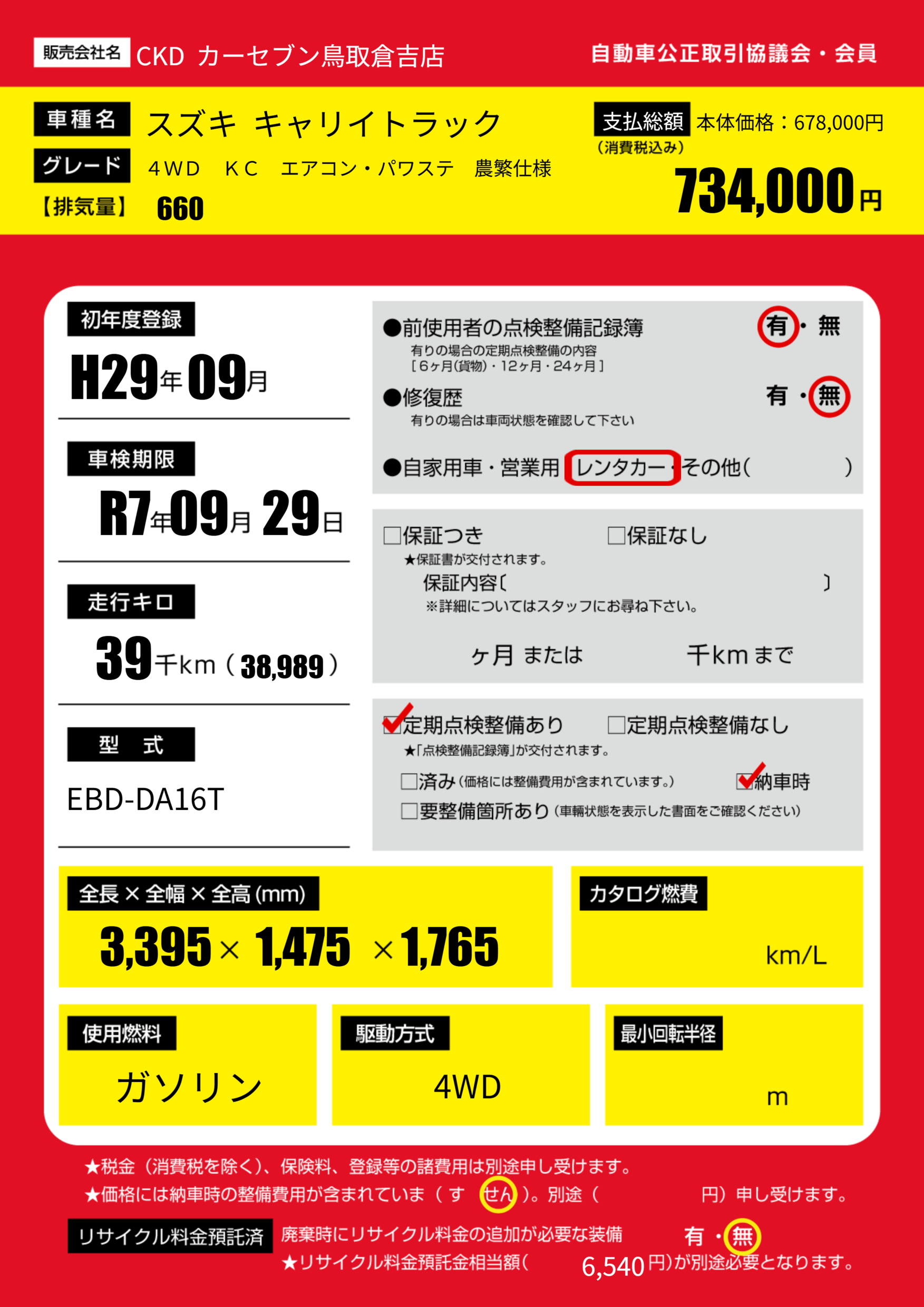 | 走行キロ | 3.9万km | 初年度登録 | H29年09月 |
