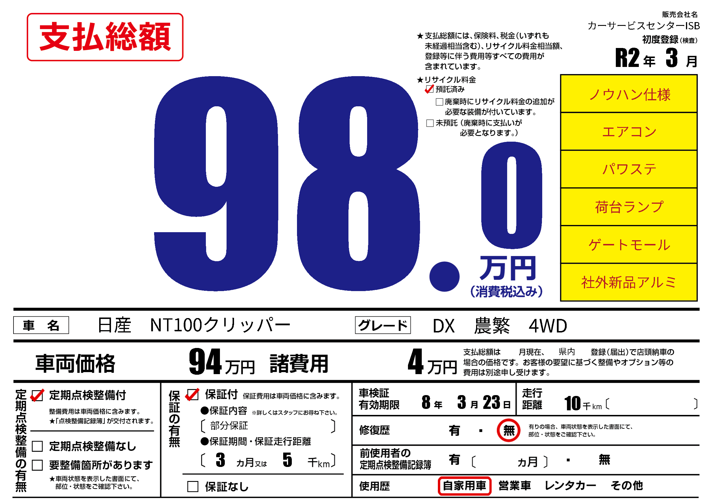 保証付き 保証内容(部分保証) 3ヶ月または(5)千kmまで |