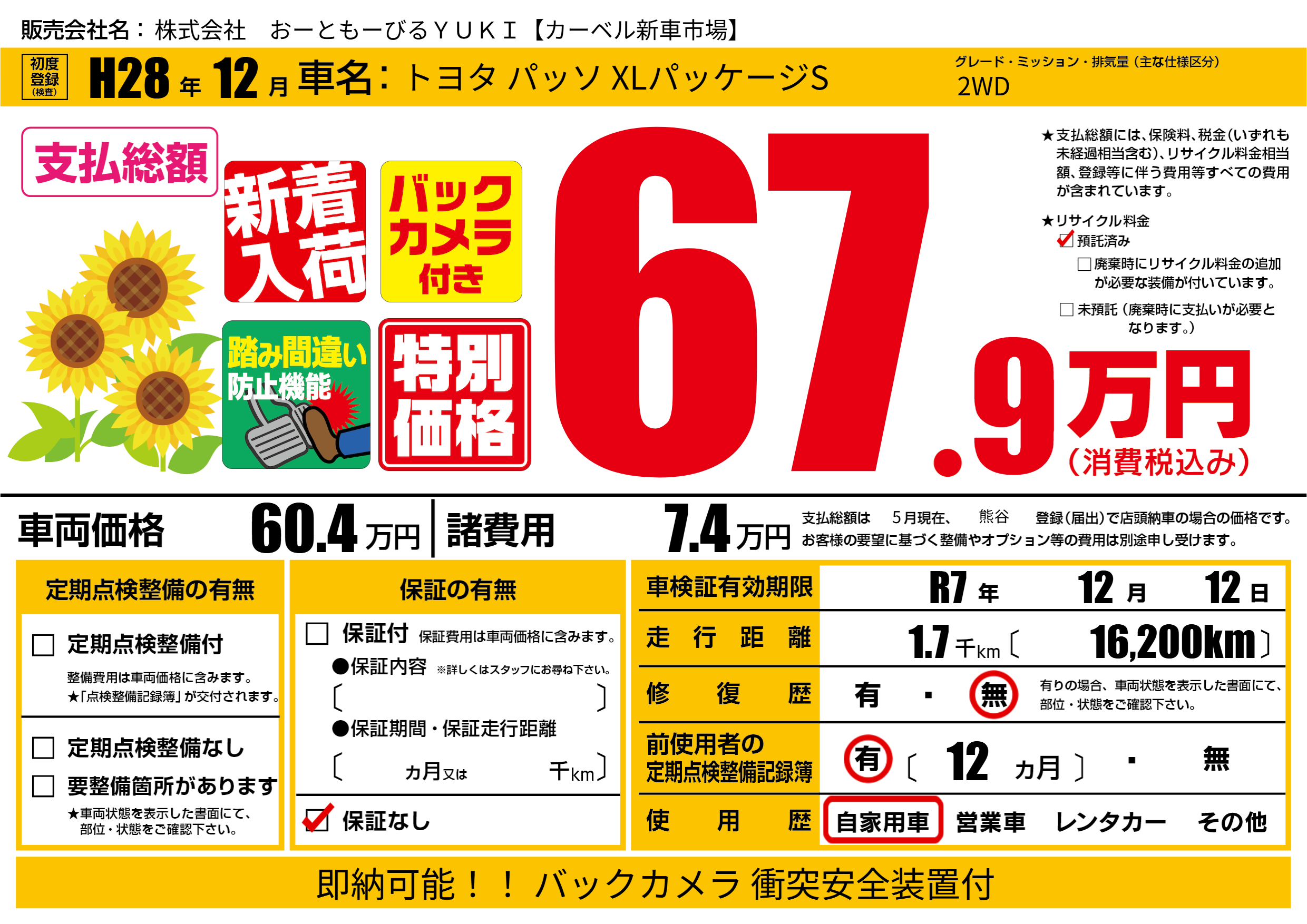 | 車名 | トヨタ パッソ XLパッケージS | グレード ミッション 排気量 |