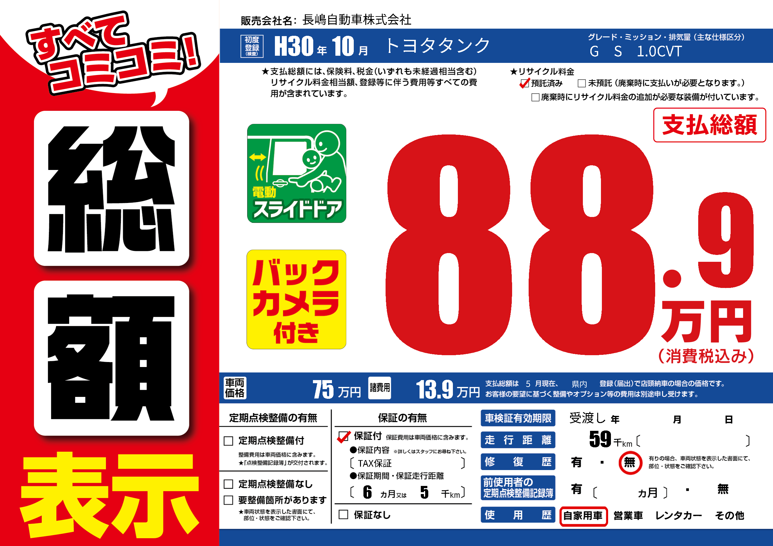 | 車名 | トヨタタンク | グレード ミッション 排気量 |