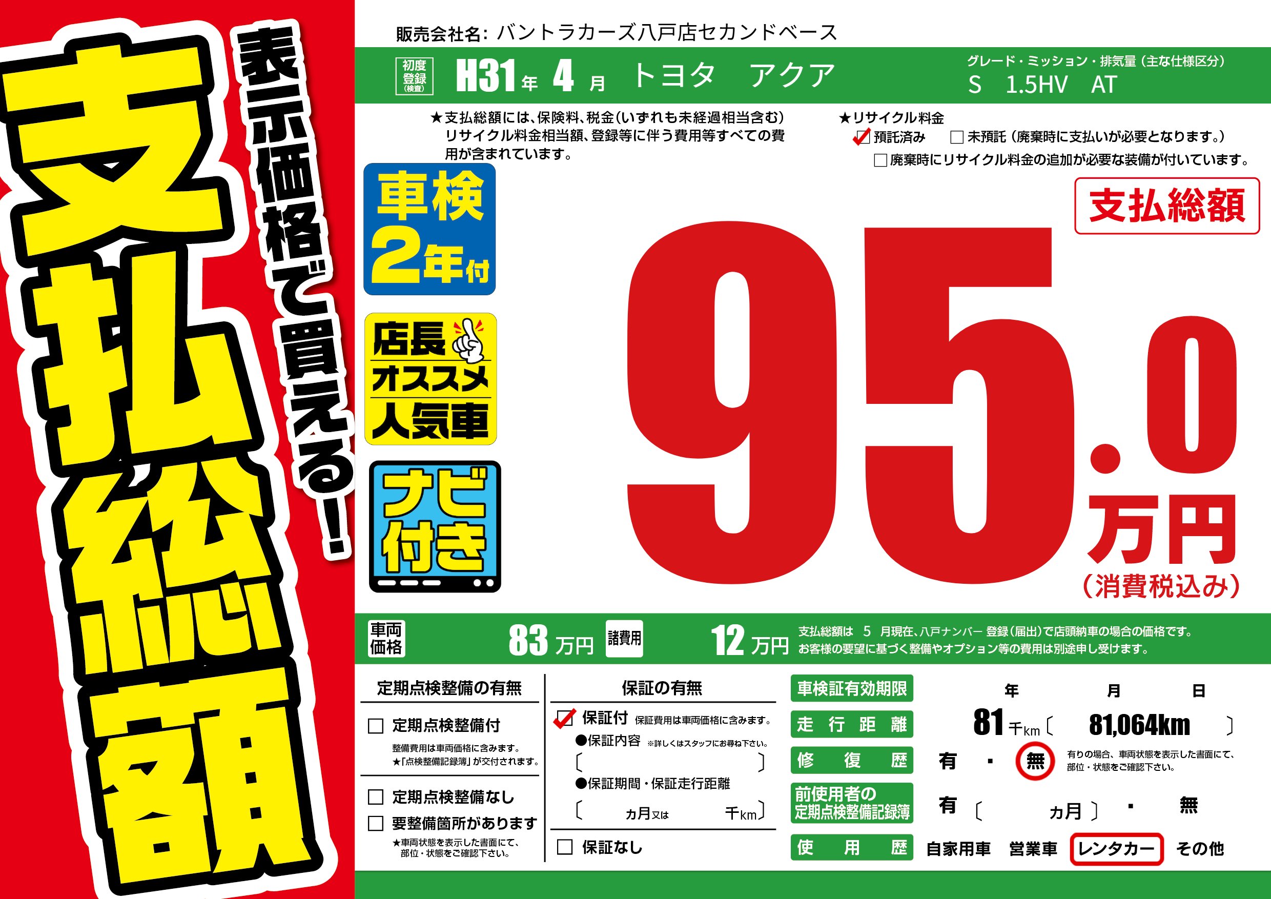 | 走行キロ | 8.1万km | 初年度登録 | H31年4月 |