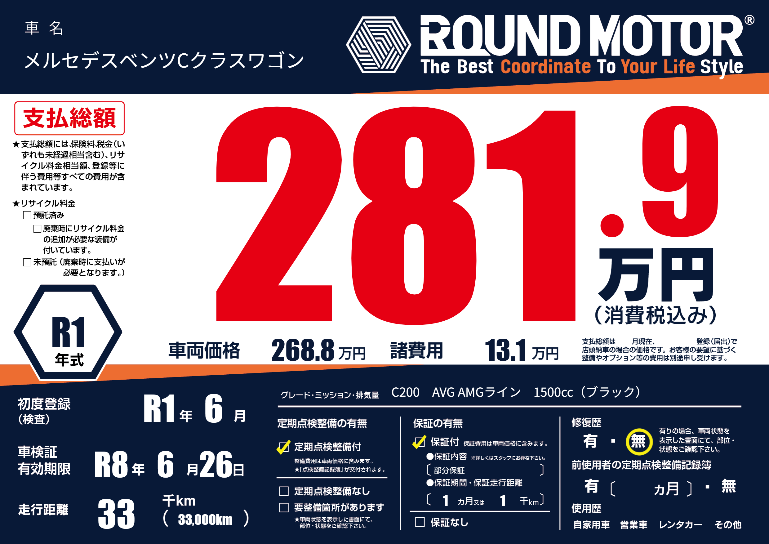 | 車名 | メルセデスベンツCクラスワゴン | グレード ミッション 排気量 |