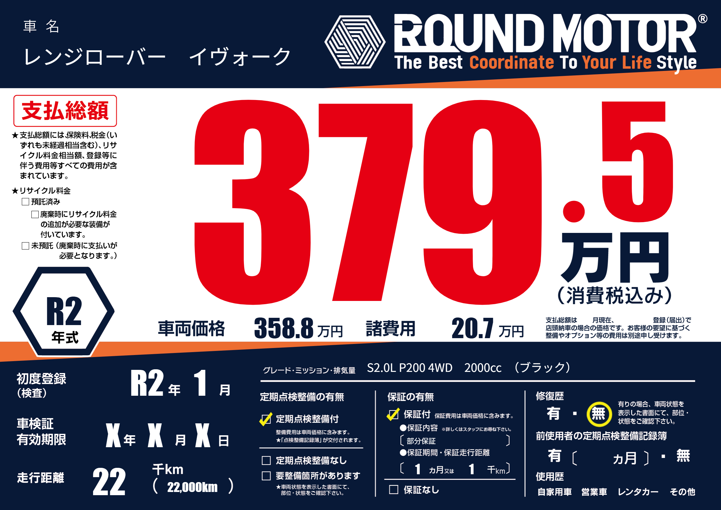 | 車名 | レンジローバー イヴォーク | グレード ミッション 排気量 |