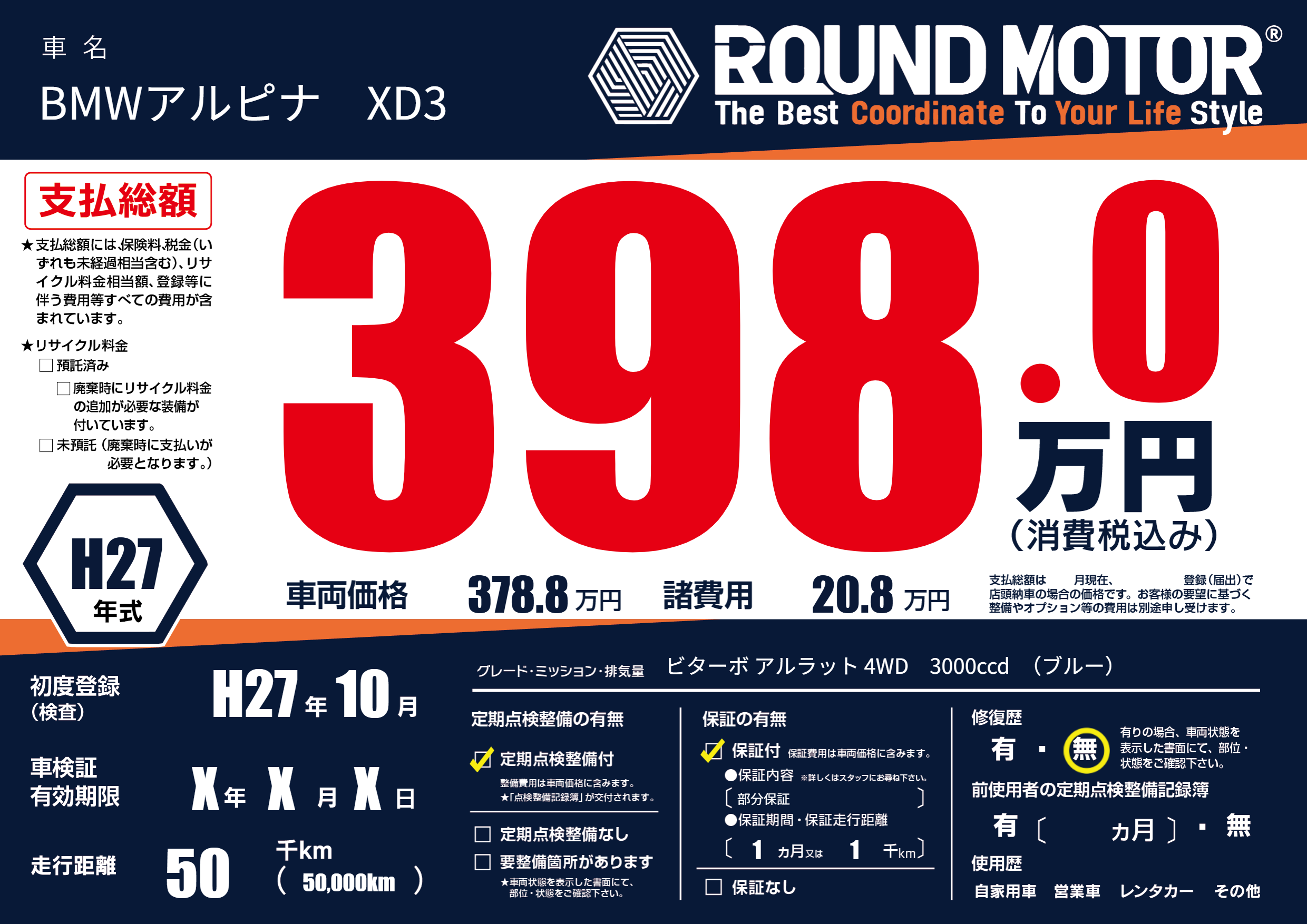 | 車名 | BMWアルピナ XD3 | グレード ミッション 排気量 |