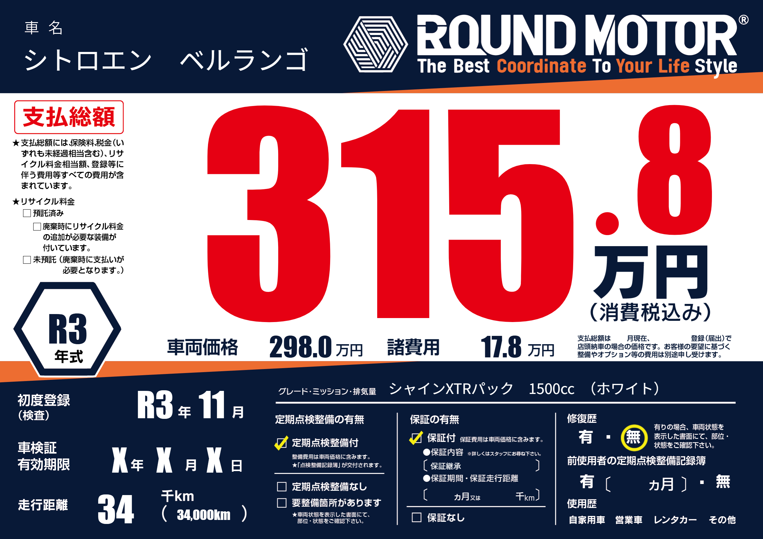 | 走行キロ | 3.4万km | 初年度登録 | R3年11月 |