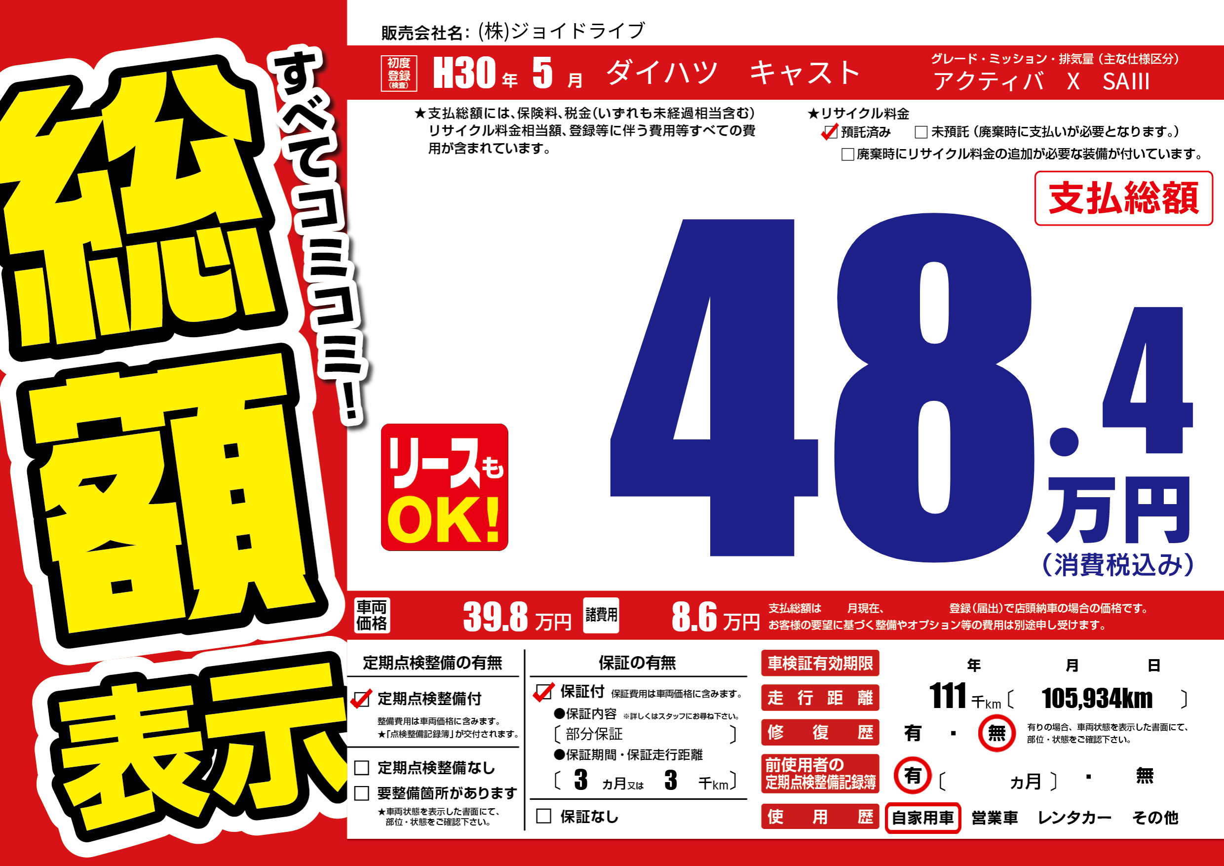 | 車名 | ダイハツ キャスト | グレード ミッション 排気量 |