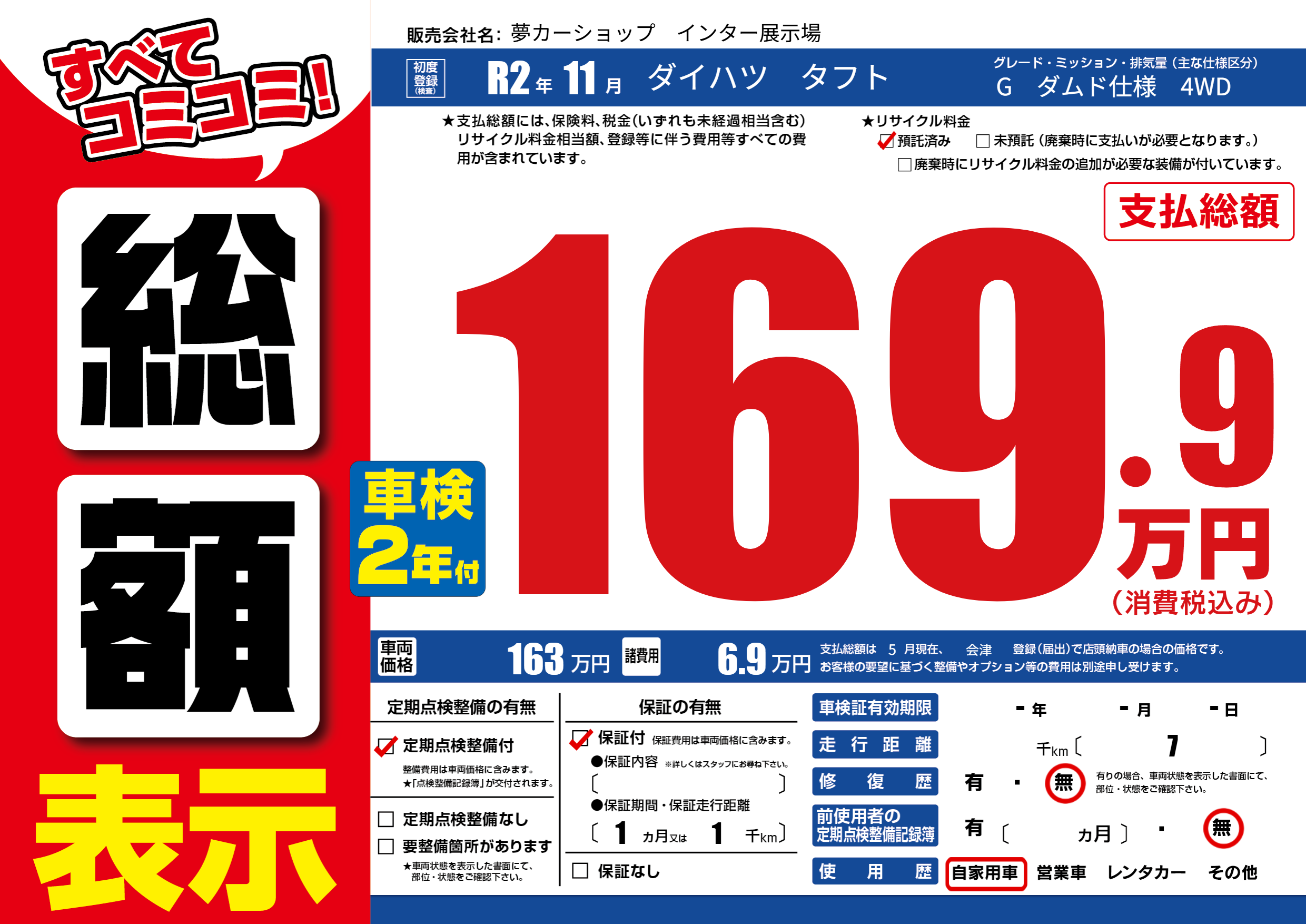 | 車名 | ダイハツ タフト | グレード ミッション 排気量 |