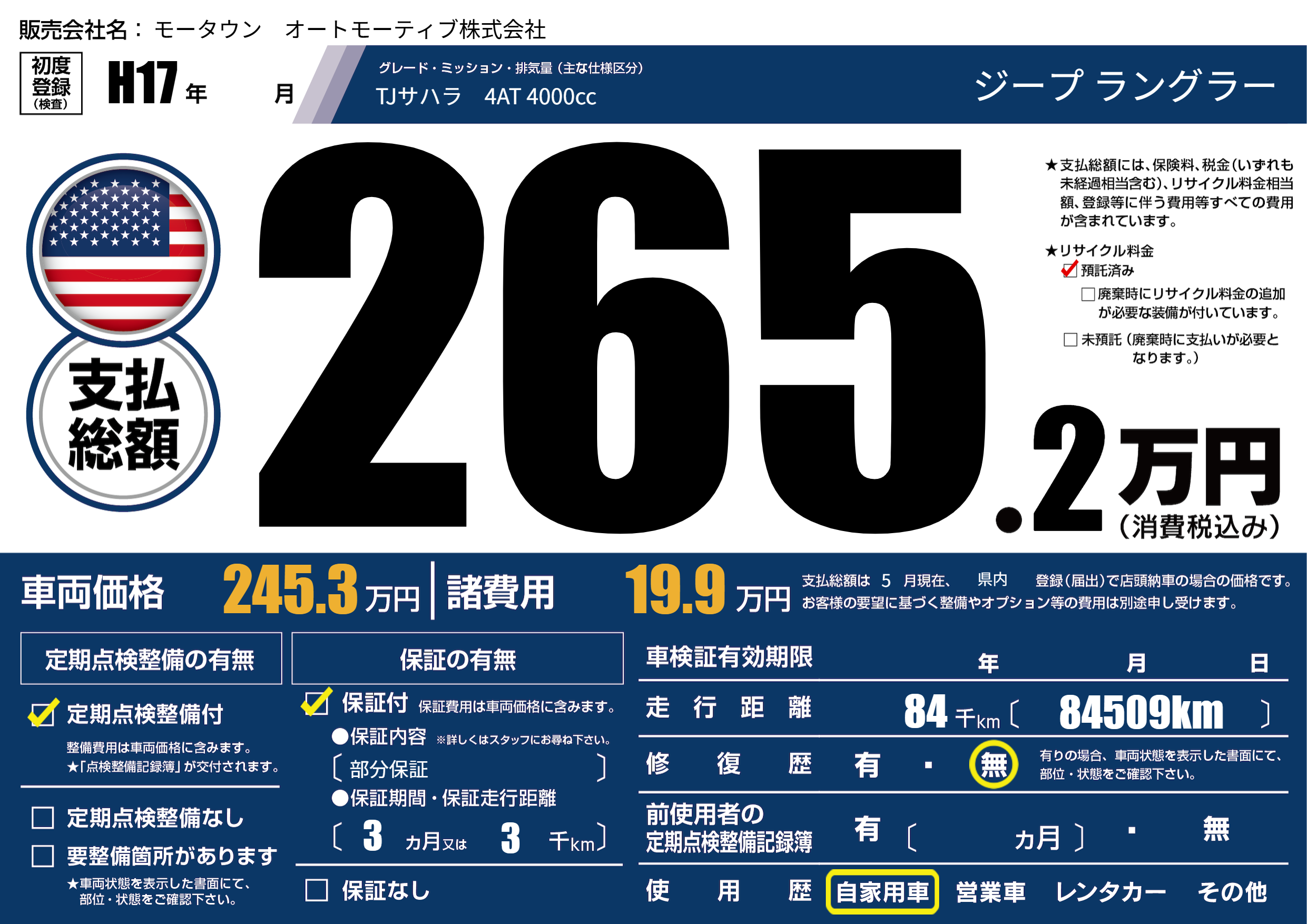 | 車名 | ジープ ラングラー | グレード ミッション 排気量 |