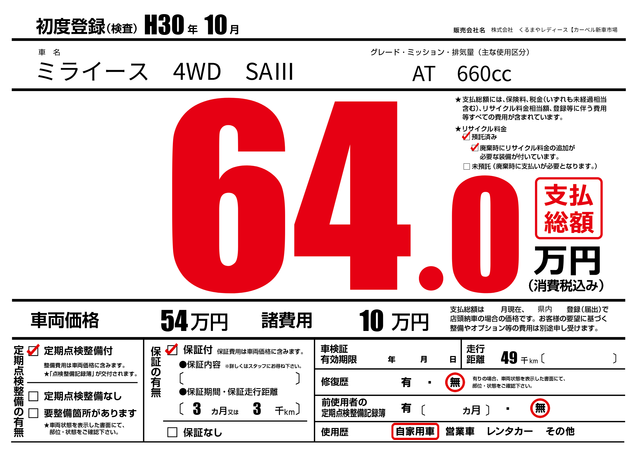 保証付き 保証内容(---) 3ヶ月または(3)千kmまで |