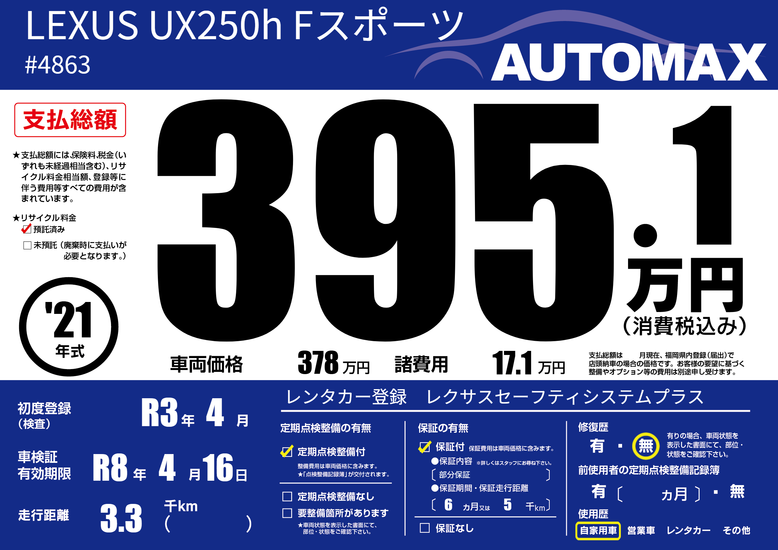| 車名 | LEXUS UX250h Fスポーツ | グレード ミッション 排気量 |