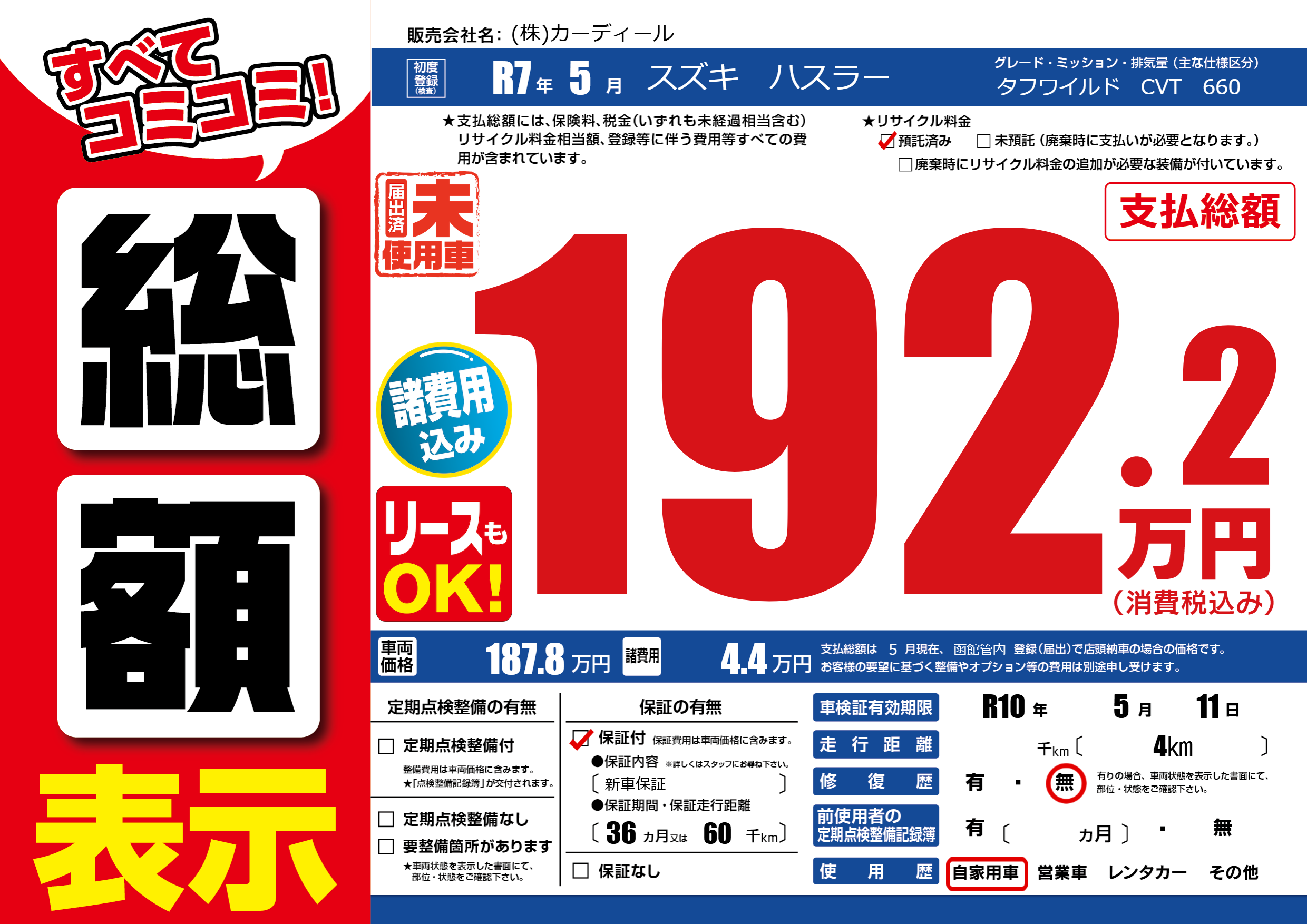 | 車名 | スズキ ハスラー | グレード ミッション 排気量 |