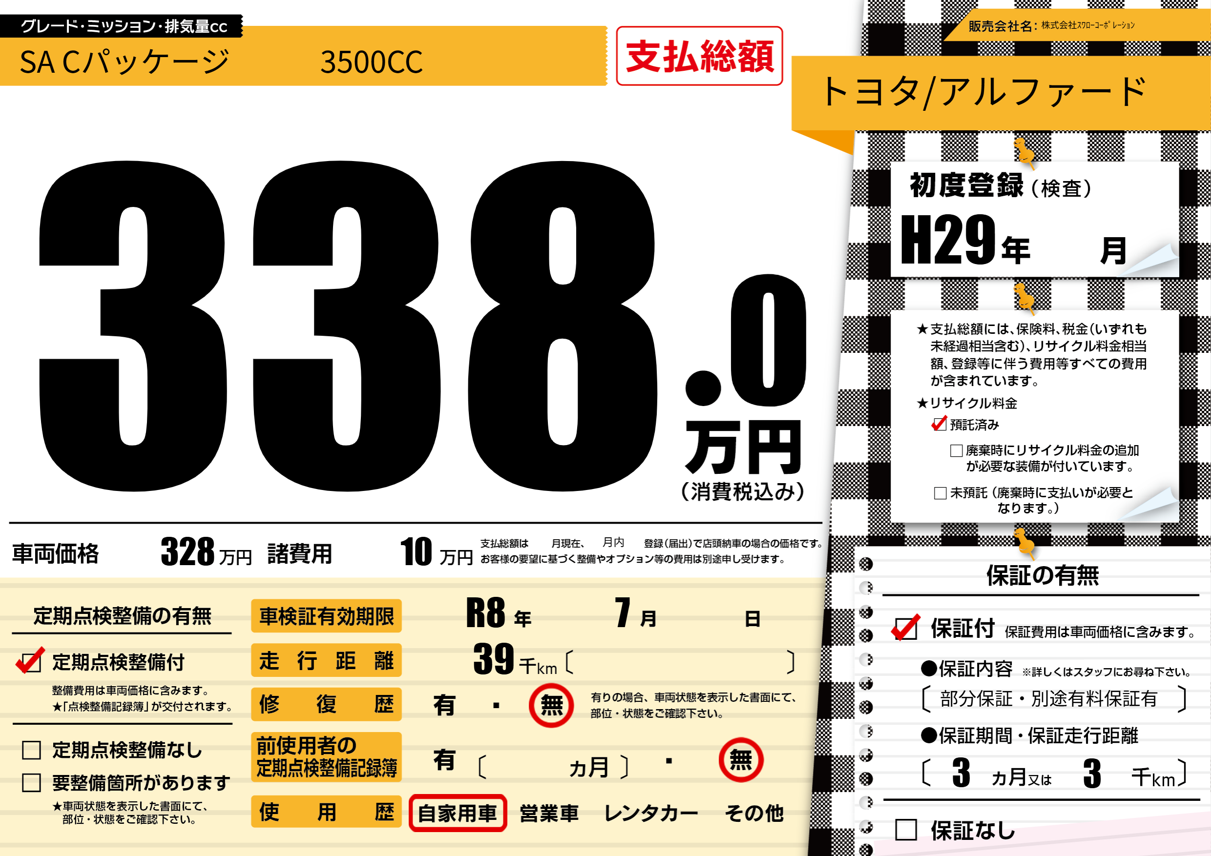 | 車名 | トヨタ/アルファード | グレード ミッション 排気量 |