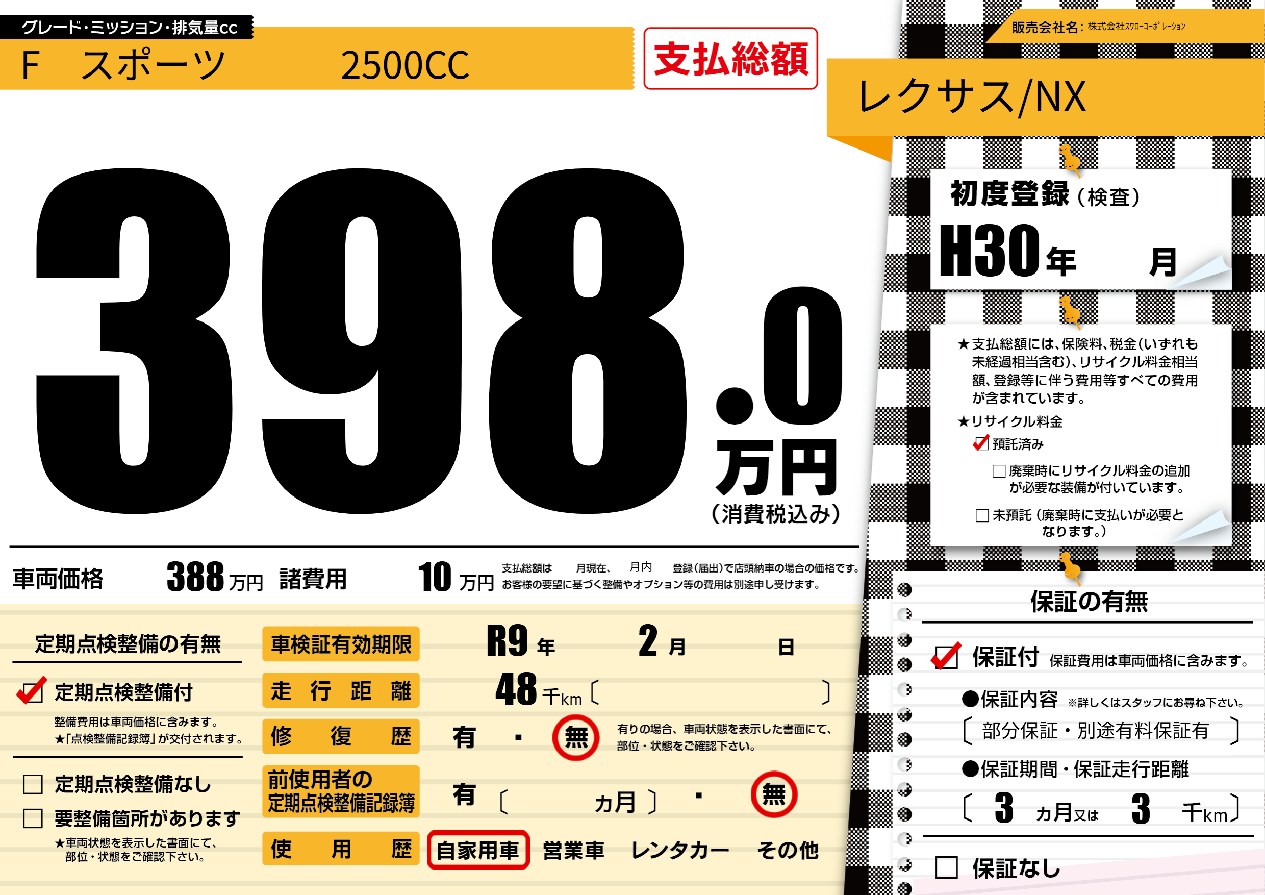 | 車名 | レクサス/NX | グレード ミッション 排気量 |