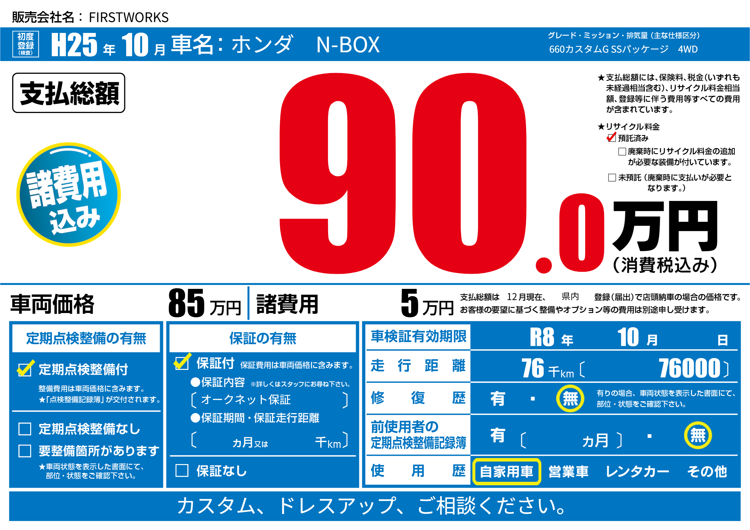 | 走行キロ | 7.6万km | 初年度登録 | H25年10月 |