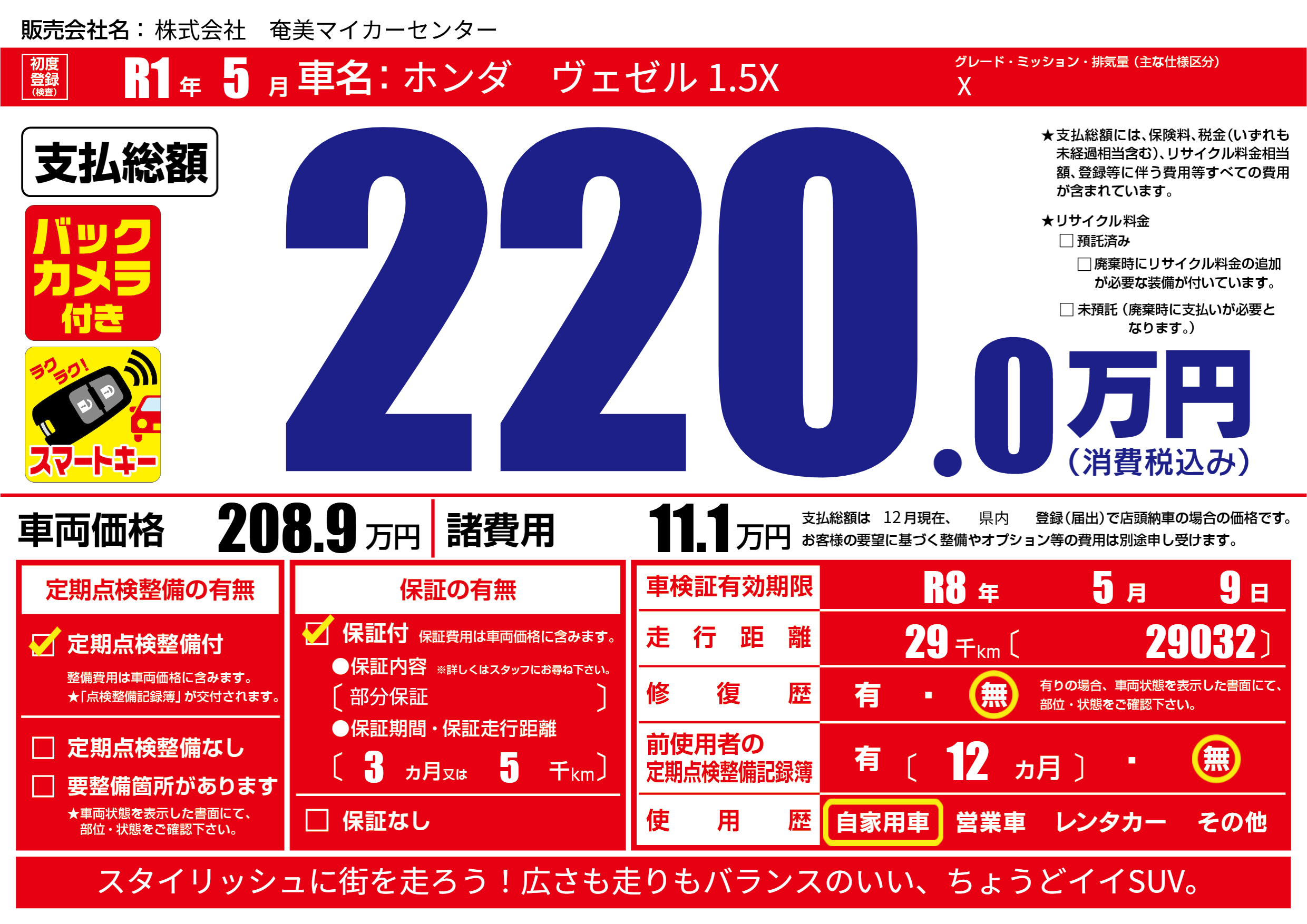 | 車名 | ホンダ ヴェゼル 1.5X | グレード ミッション 排気量 |