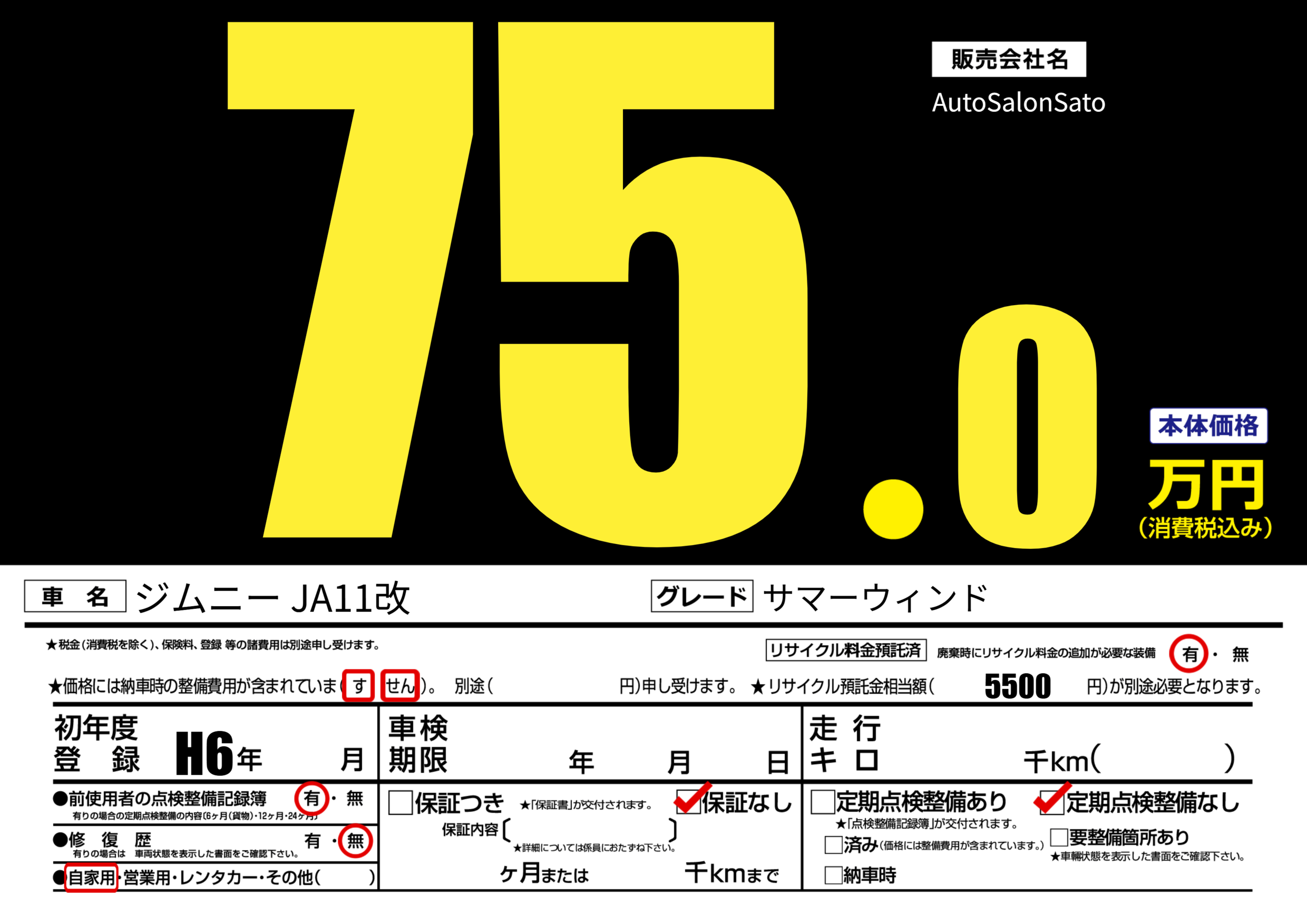 あり | リサイクル預託金相当額 | ( 5500円)が別途必要 |