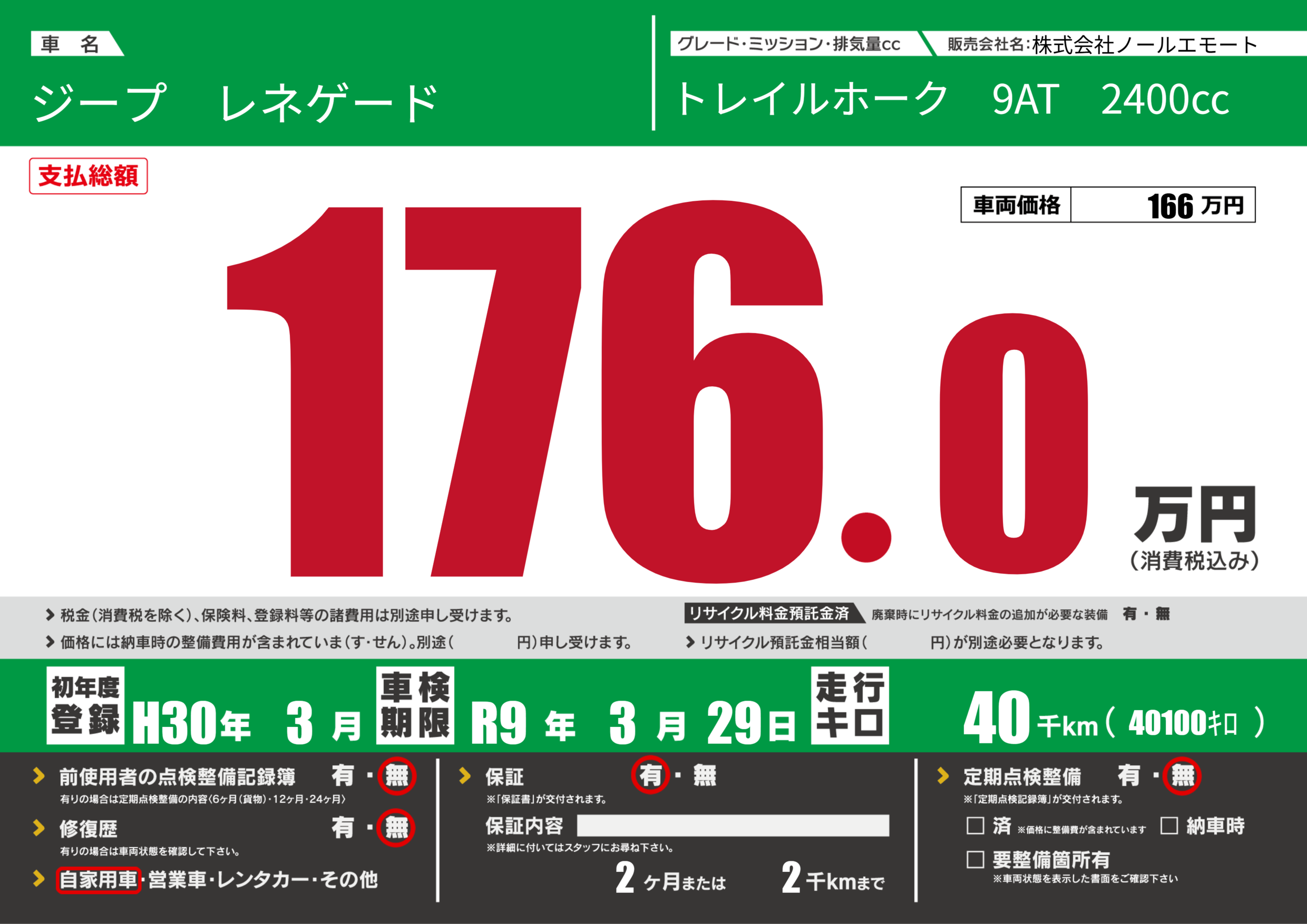 | 走行キロ | 4万km | 初年度登録 | H30年3月 |