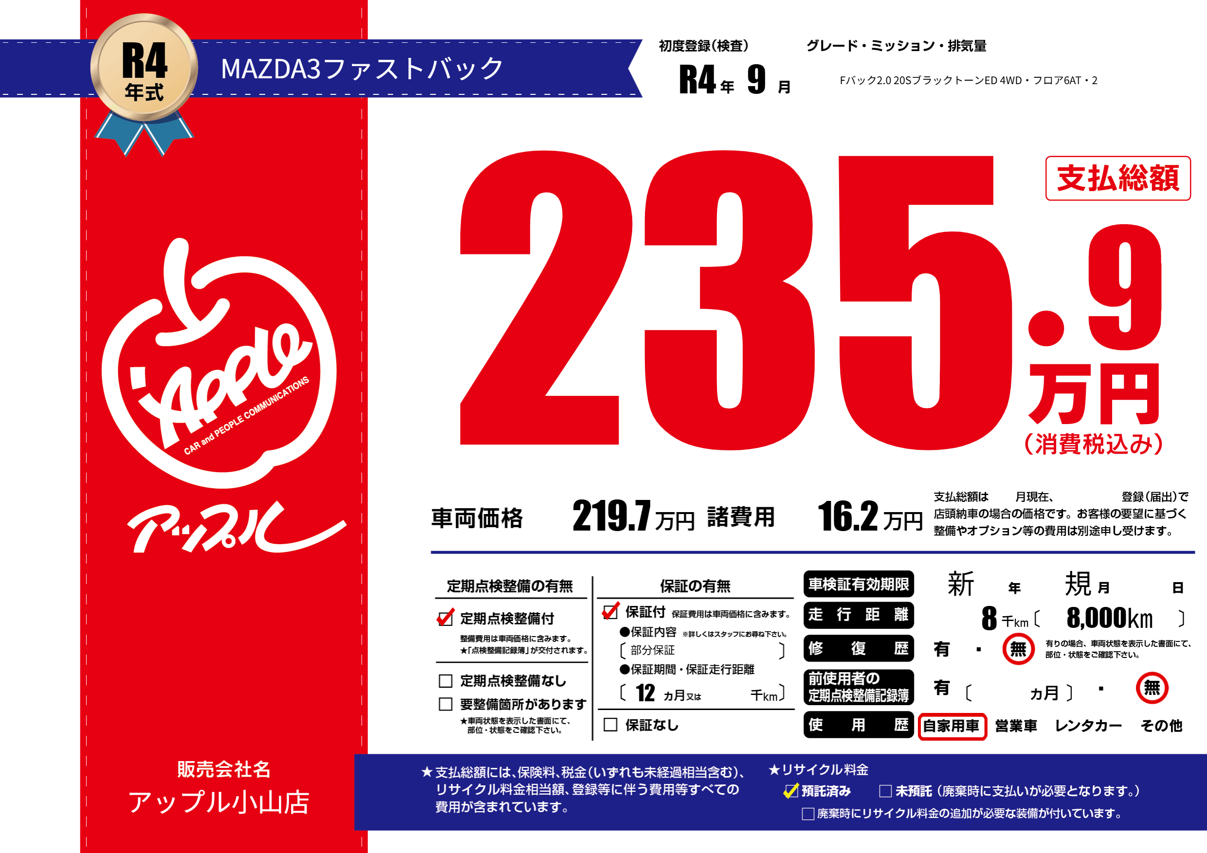 | 走行キロ | 0.8万km | 初年度登録 | R4年9月 |