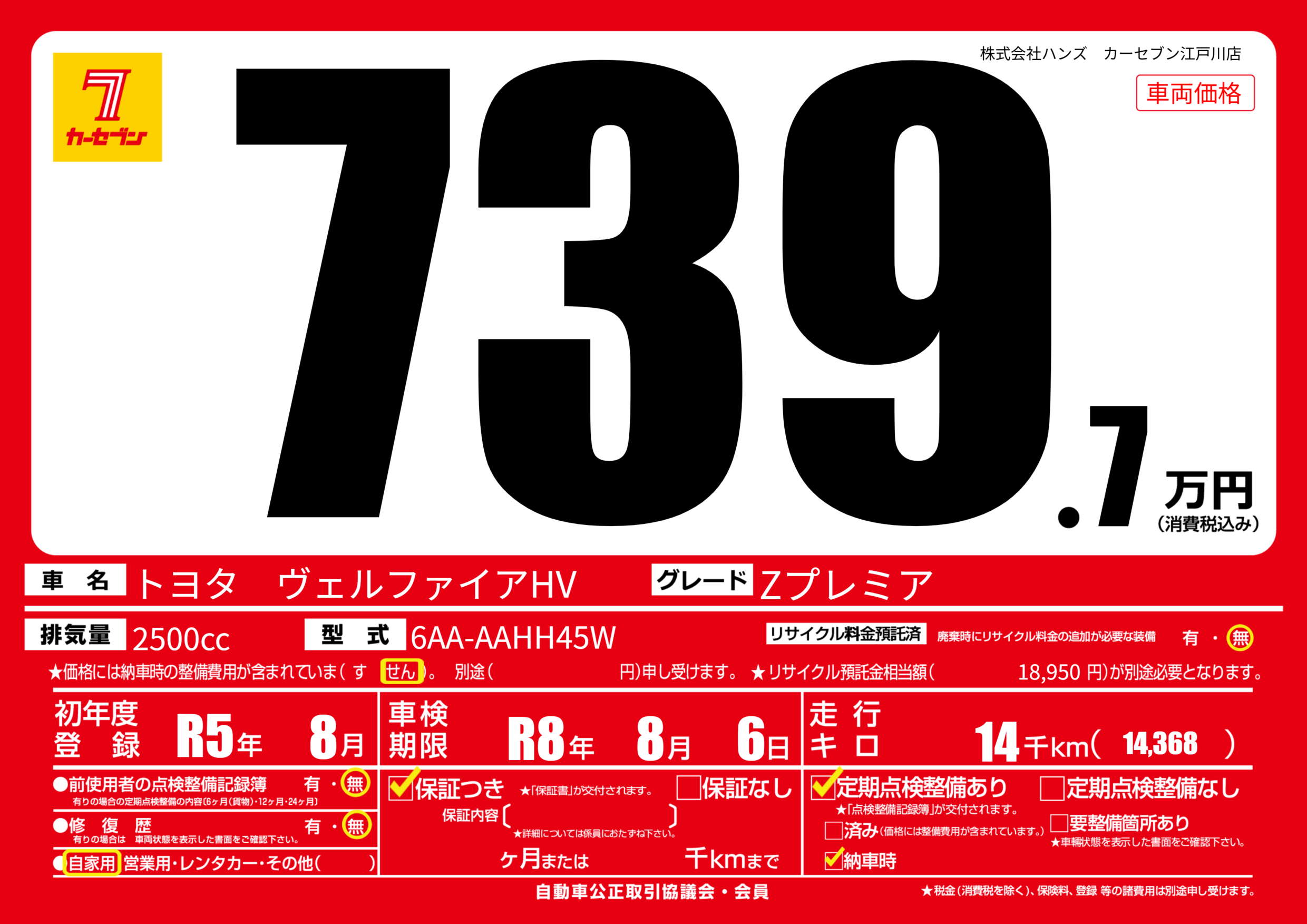| 走行キロ | 1.4万km | 初年度登録 | R5年8月 |