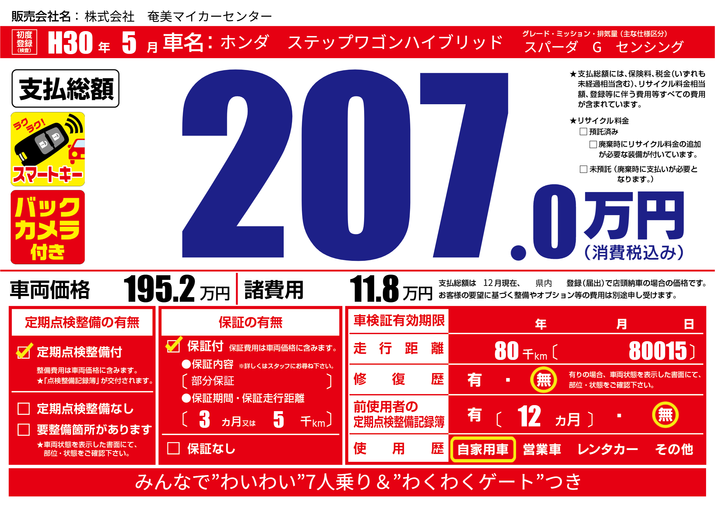 | 走行キロ | 8万km | 初年度登録 | H30年5月 |
