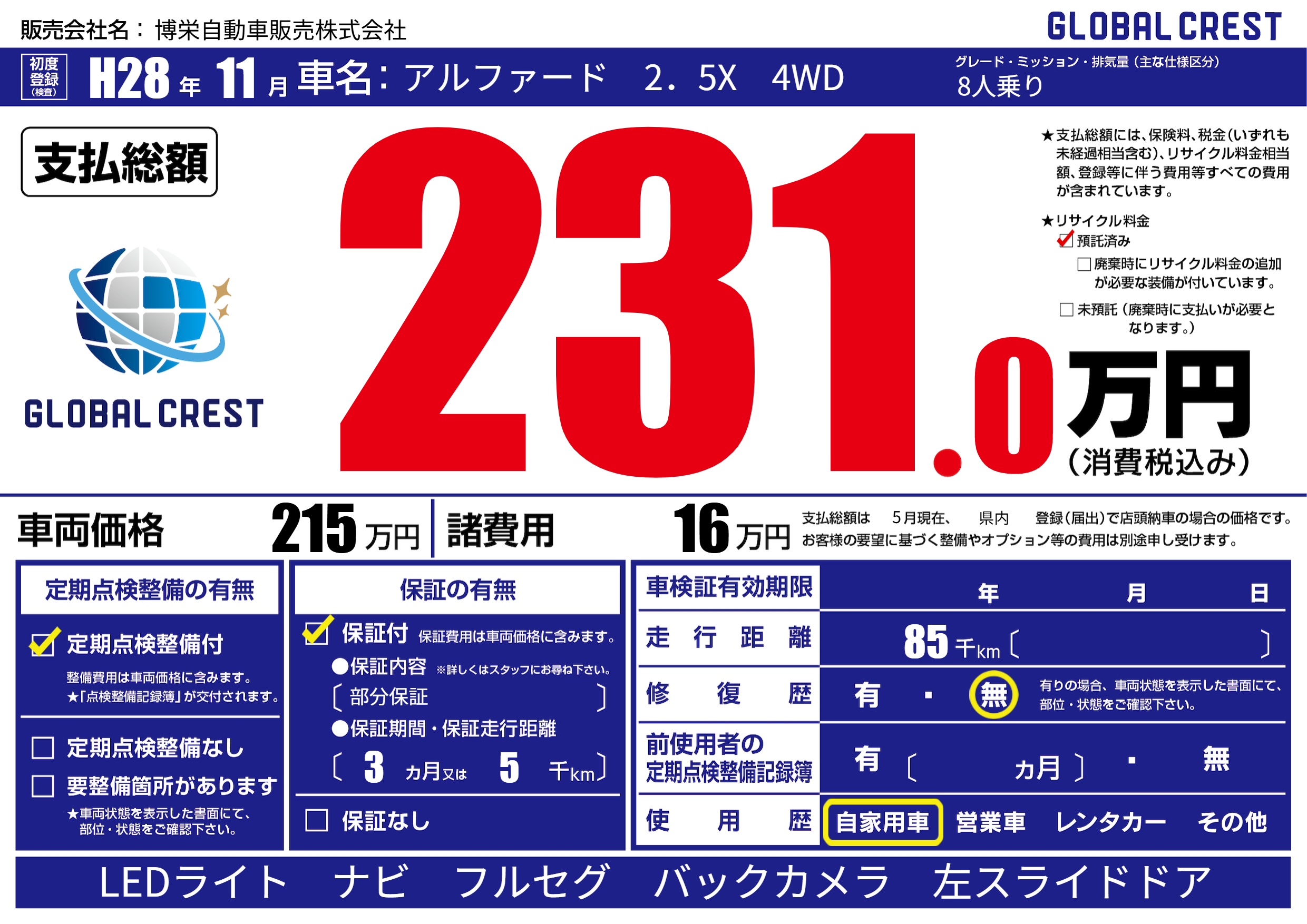 | 車名 | アルファード 2.5X 4WD | グレード ミッション 排気量 |